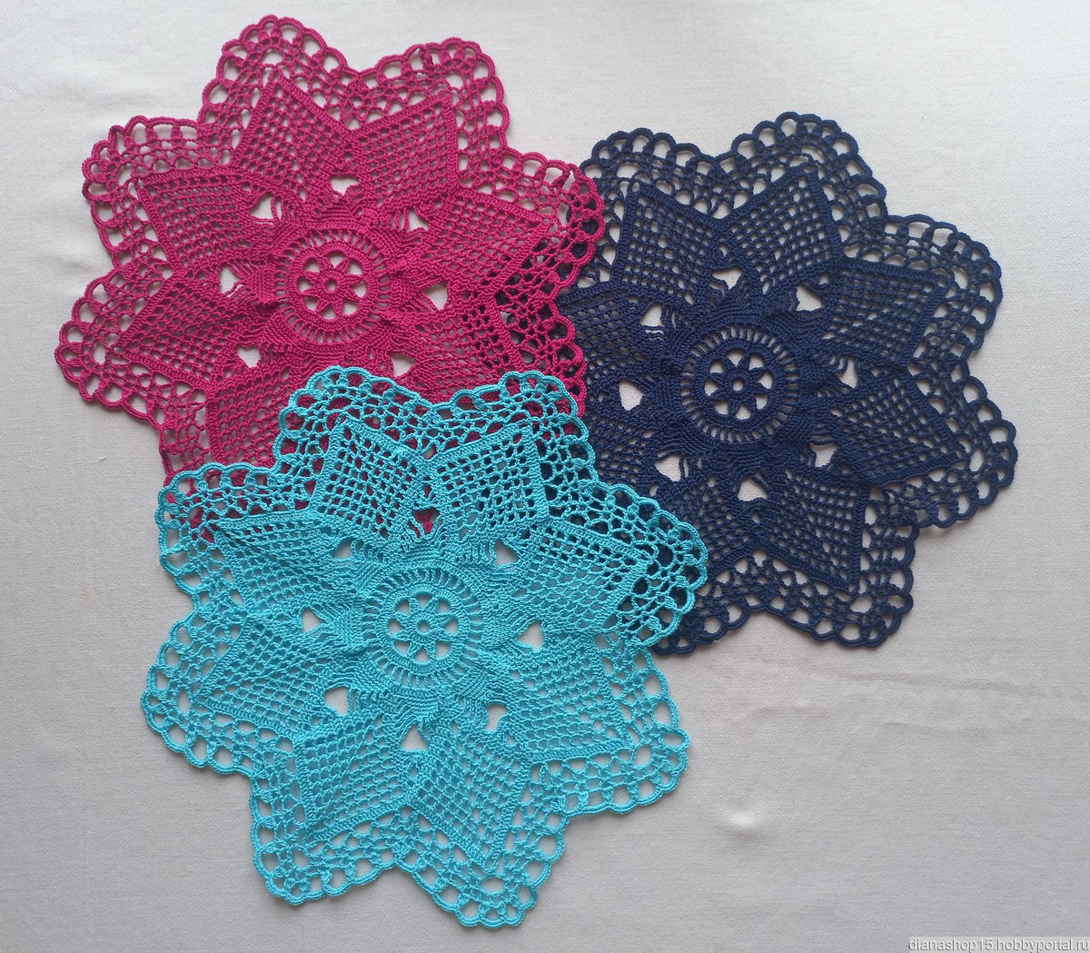 Ажурная салфетка связана вручную из 100% хлопка, размер 27 см в диаметре.