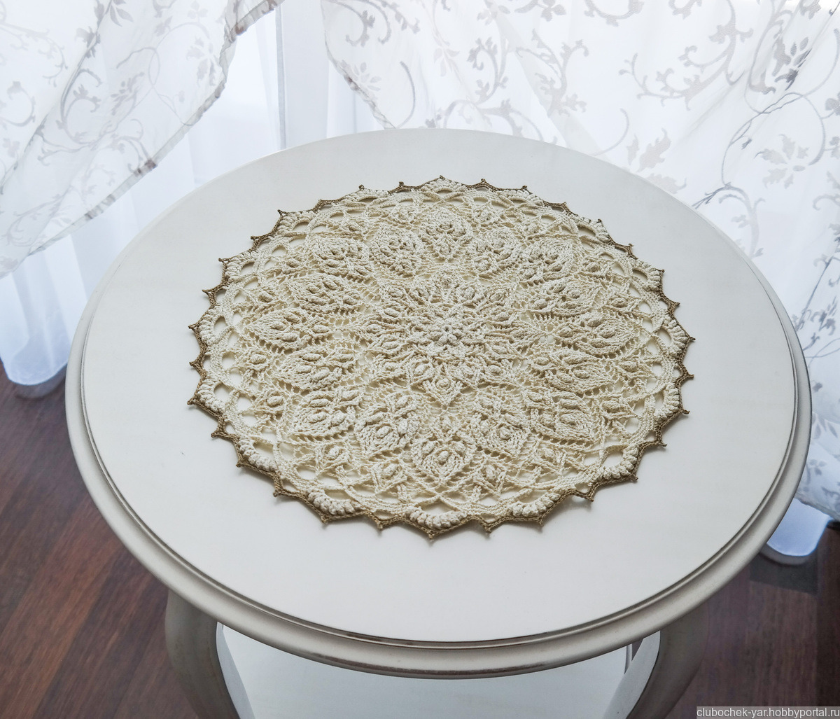 Салфетка связана крючком по дизайну Грейс Ферон. Нитки VITA SHINY, хлопок с люрексом, цвет молочный с золотом, пр-во Турция. Диаметр 40 см. Благодаря оригинальному дизайну, изысканному благородному цвету с золотистыми переливами салфетка смотрится в интерьере очень нарядно и празднично.