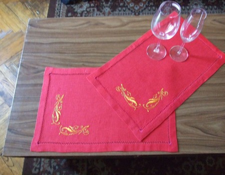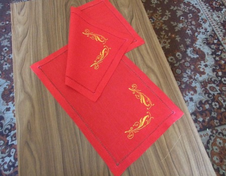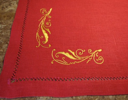 Салфетки выполнены из красного льна, вышиты золотистыми шелковыми нитками, края отделаны мережкой. Работа полностью ручная. Очень красивая салфетка. Подойдет для сервировки стола. Хороший подарок на НГ.Цена указана за 1 шт.При покупке 4-х салфеток цена 2000 руб.Доставка:самовывоз из Люберец или отправка почтой после предоплаты(цена+почт.расходы).