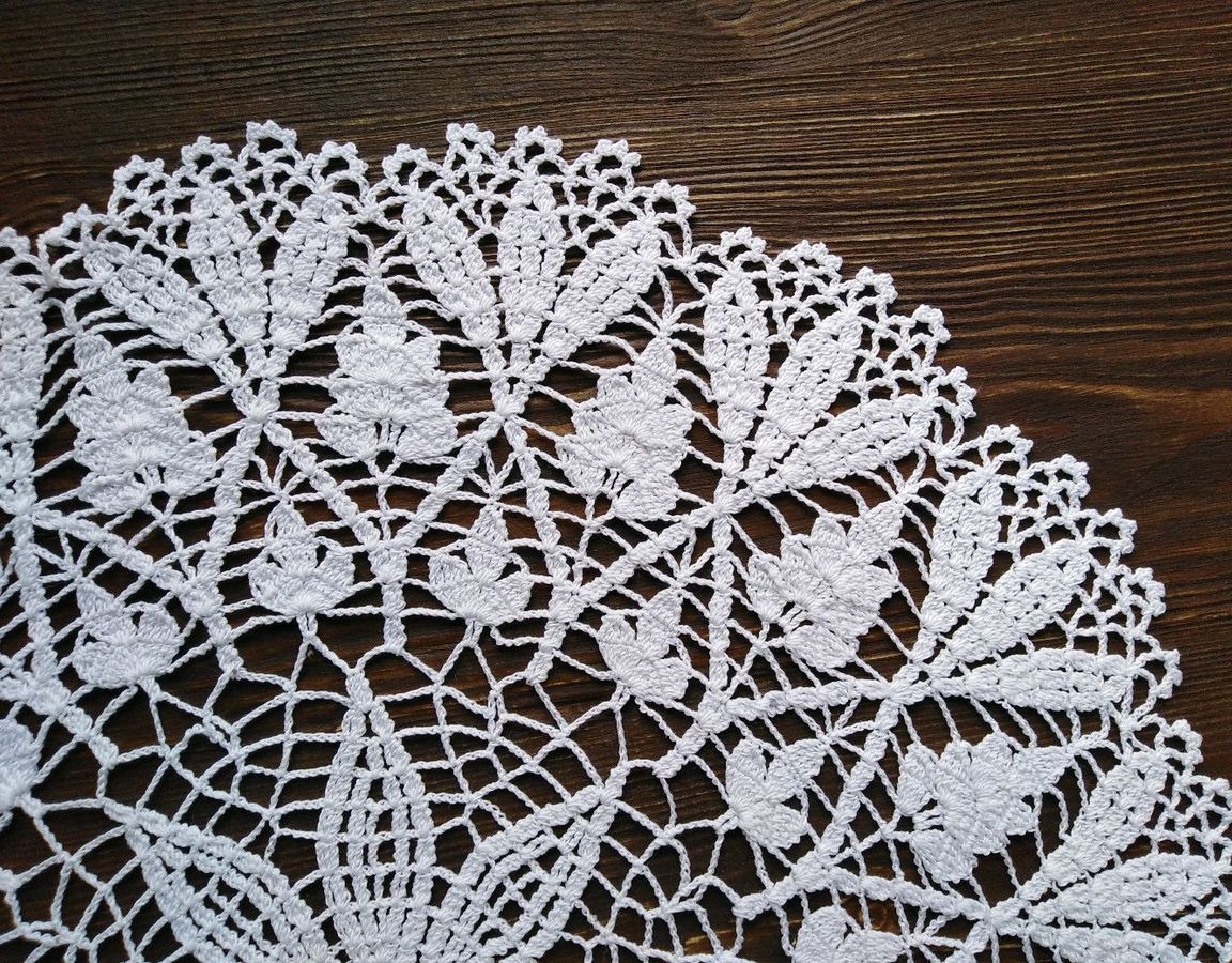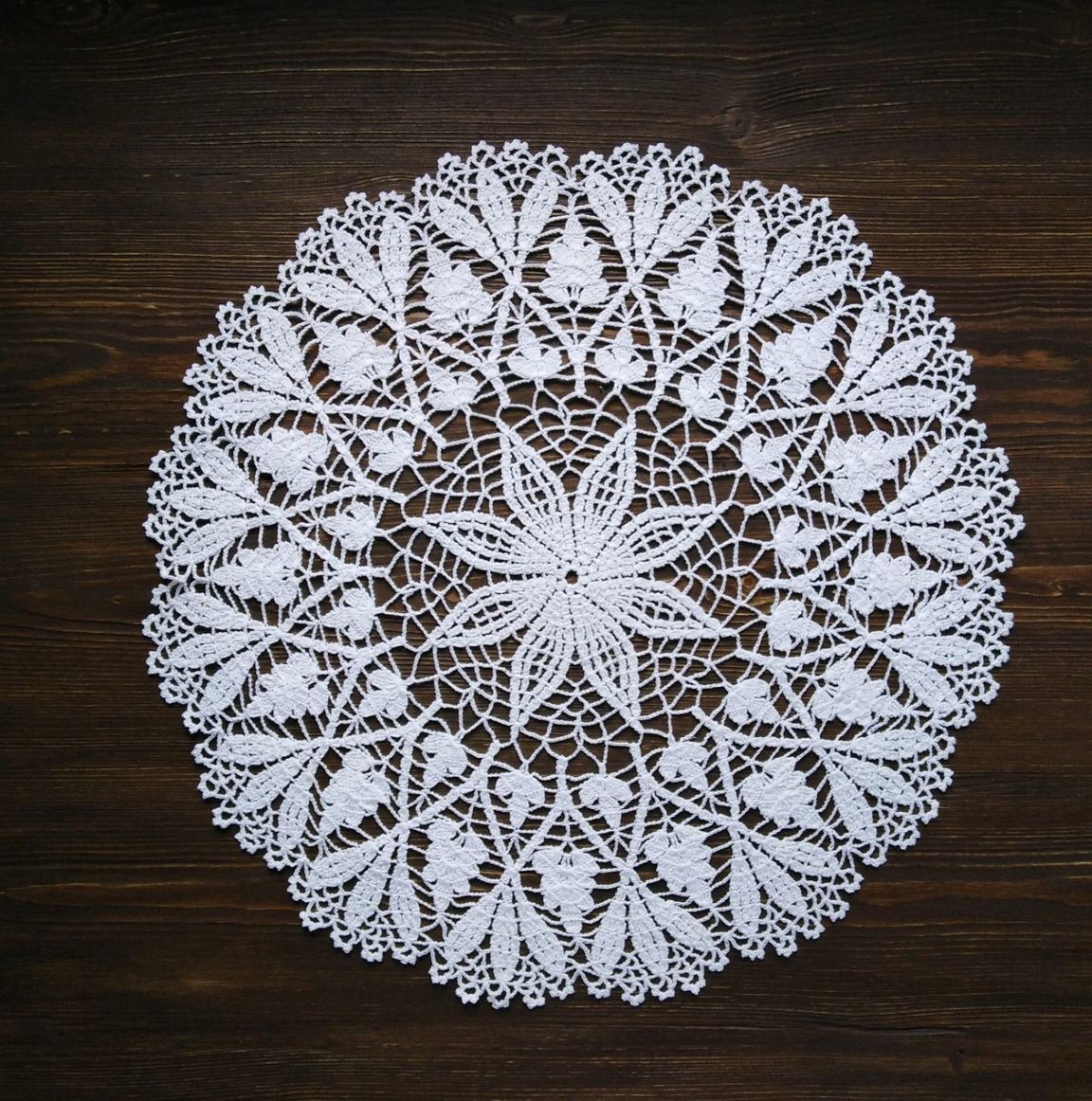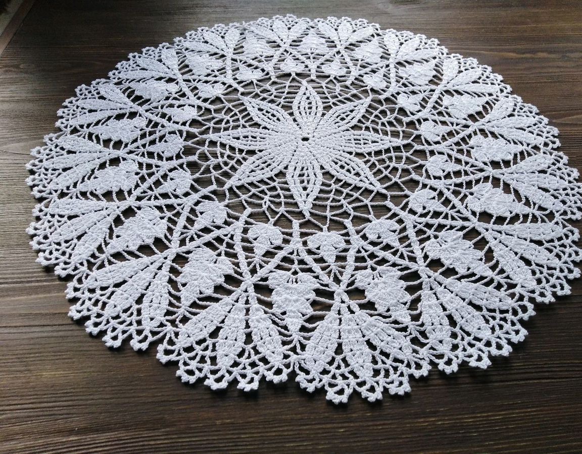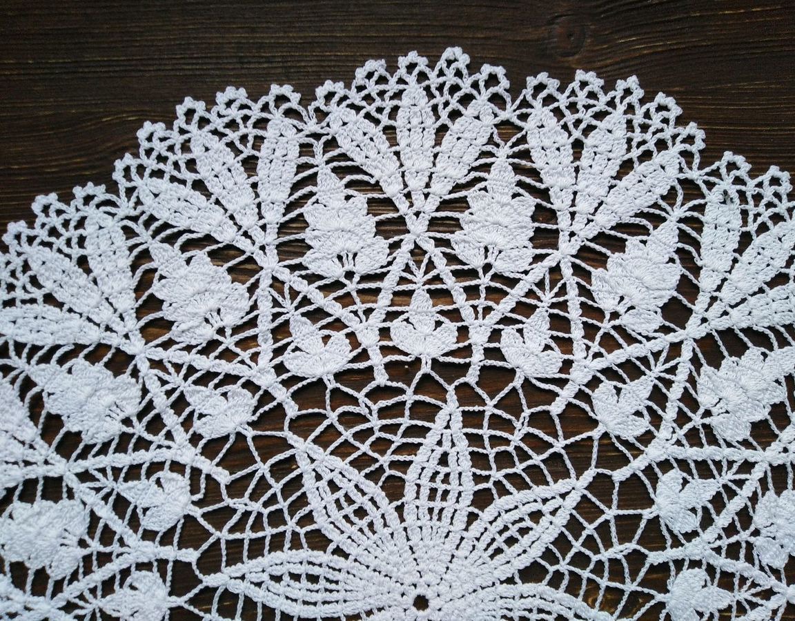 Ажурная белоснежная салфетка, связанная тонким крючком из натурального мерсеризованного хлопка. Превосходно украсит интерьер, защитит поверхность мебели от царапин. Будет прекрасным подарком для женщины, замечательным аксессуаром при проведении фотосессий и предметной съёмки.