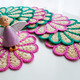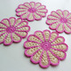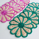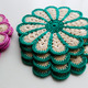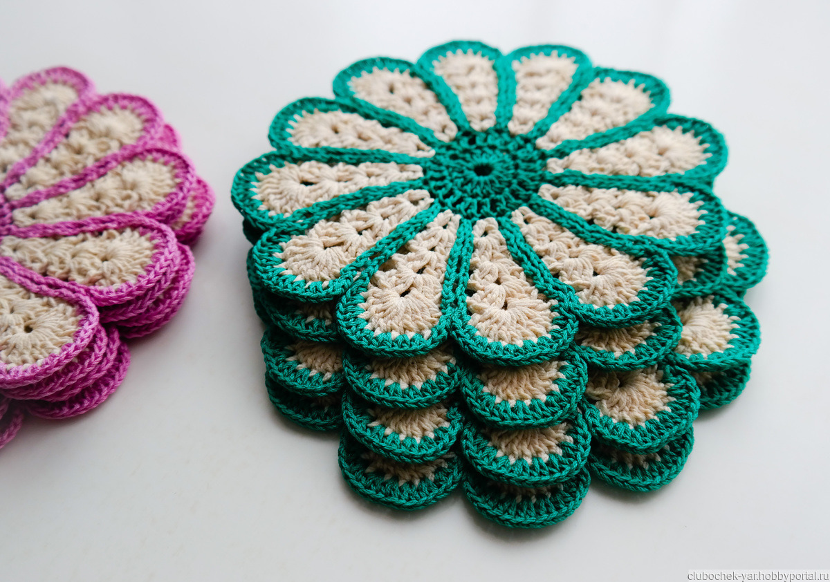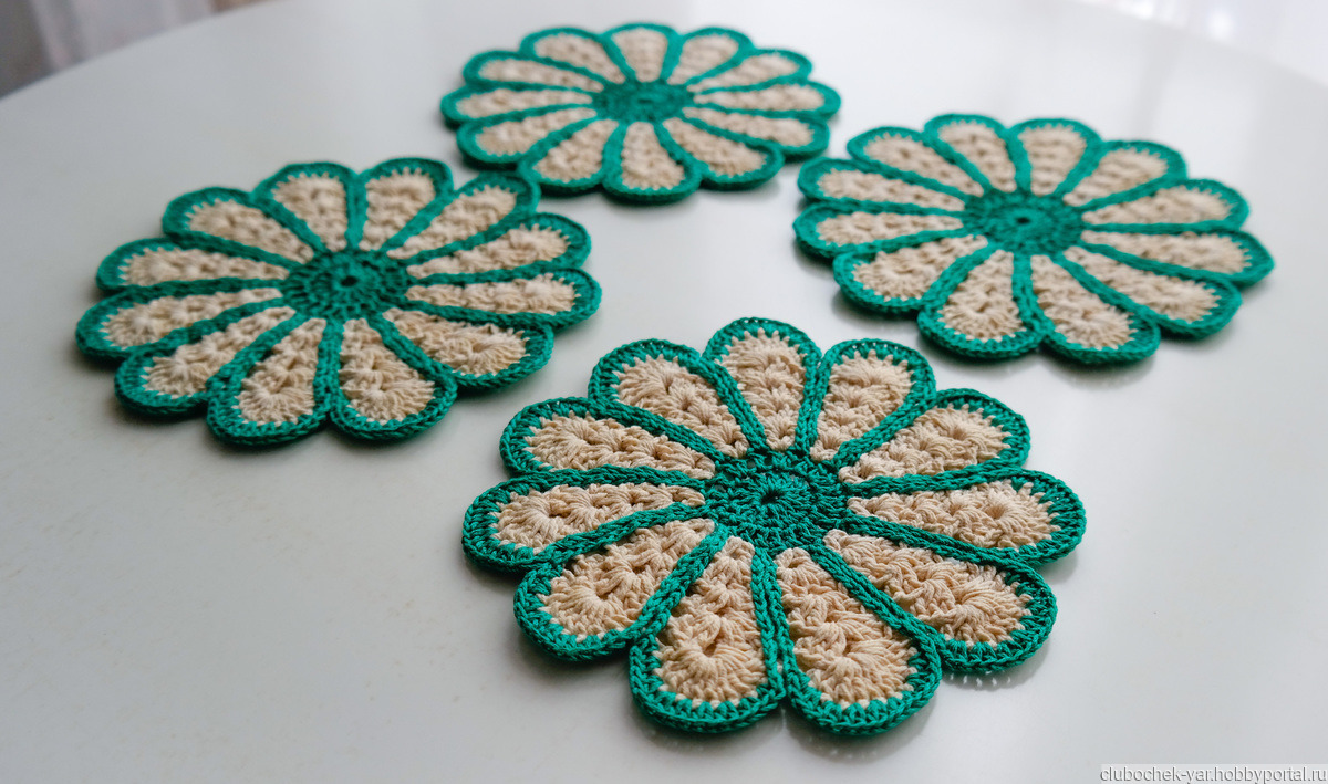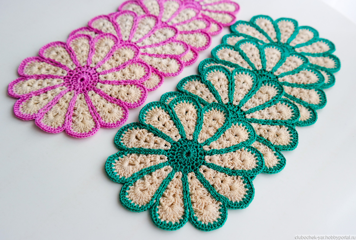 Небольшие салфетки для сервировки стола, или могут использоваться как самостоятельная часть интерьера. В диаметре 15 см. Связаны из ниток 100% хлопок. В наличии салфетки с розовыми и зелеными лепестками, по 4 шт. в каждом цвете. Стоимость одной салфетки 120 руб.