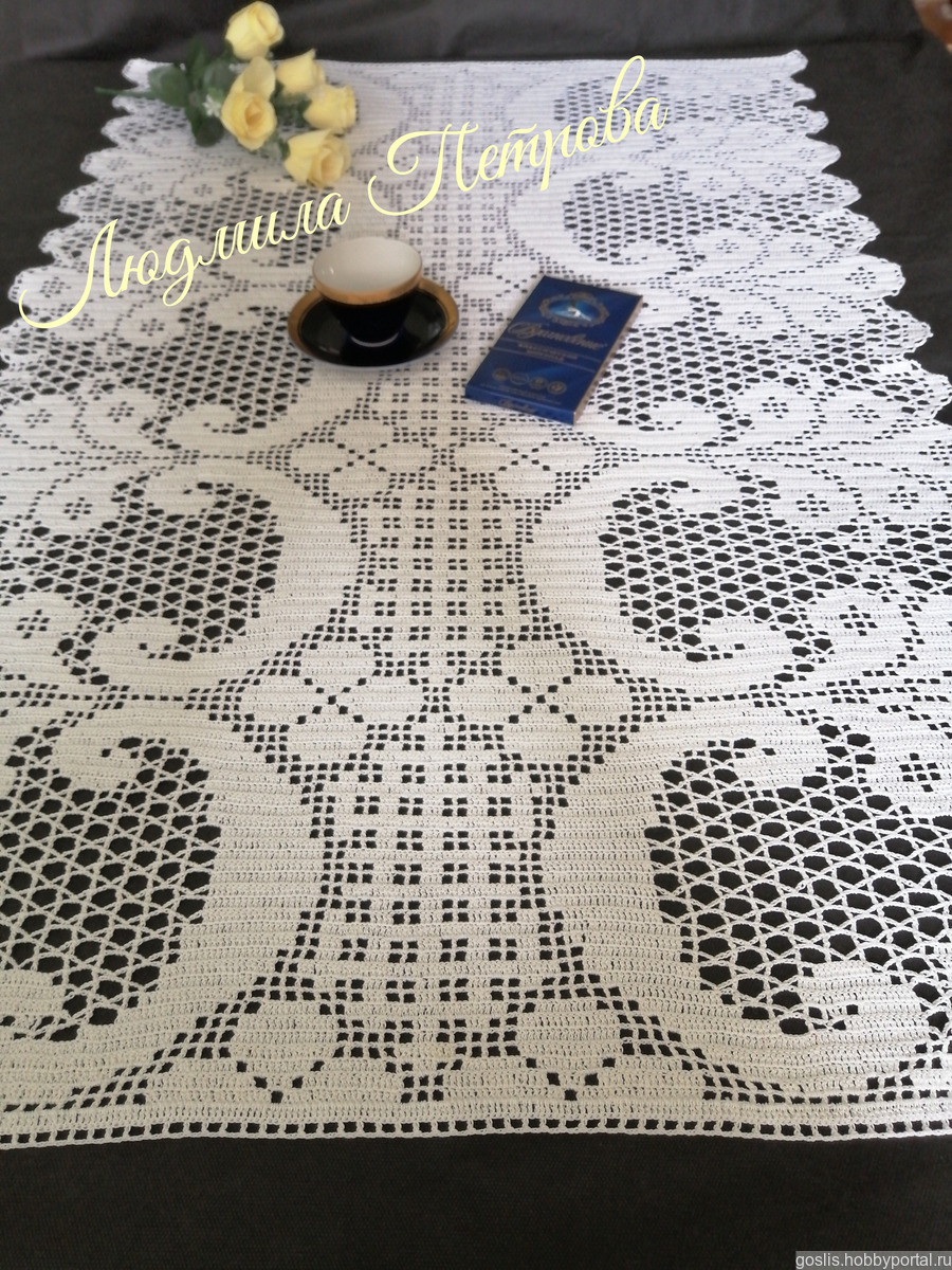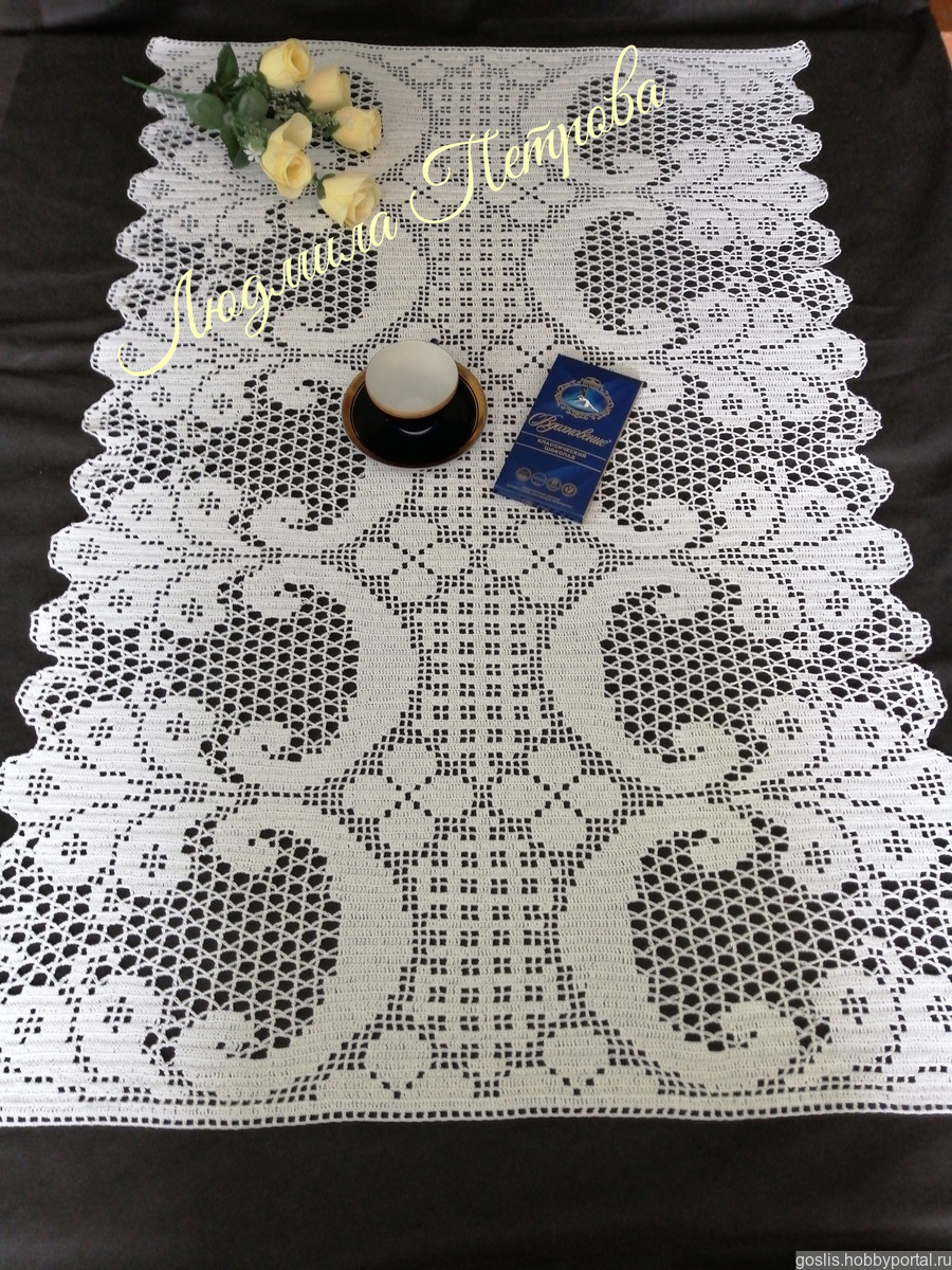Скатерть - дорожка вязаная крючком в филейной технике на стол, на комод... Можно связать в качестве занавески, шторы.