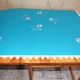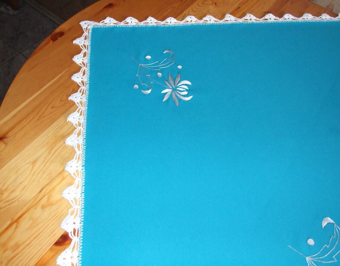 Скатерть выполнена из га барщина х бирюзового цвета. Ручная вышивка гладью,п о периметру скатерти-кружево ручной вязки. Очень красивая скатерть, послужит великолепным подарком или для украшения своего дома. Скатерть можно скомплектовать с салфетками (2шт.),см.фото 5,6 или магазин. Стоимость комплекта (скатерть + 2 салфетки) - 3500 руб. Габардин легко стирается и легко гладится. Работа готова к продаже. Можно сделать на заказ в другом цвете и с другим рисунком.
