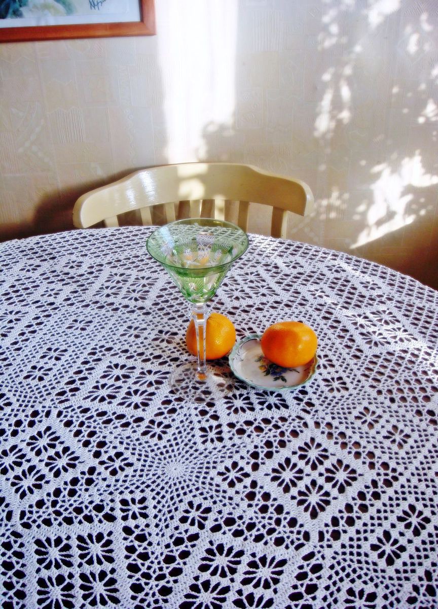 Скатерть связана крючком из хлопка белого цвета, диаметром 180 см..