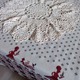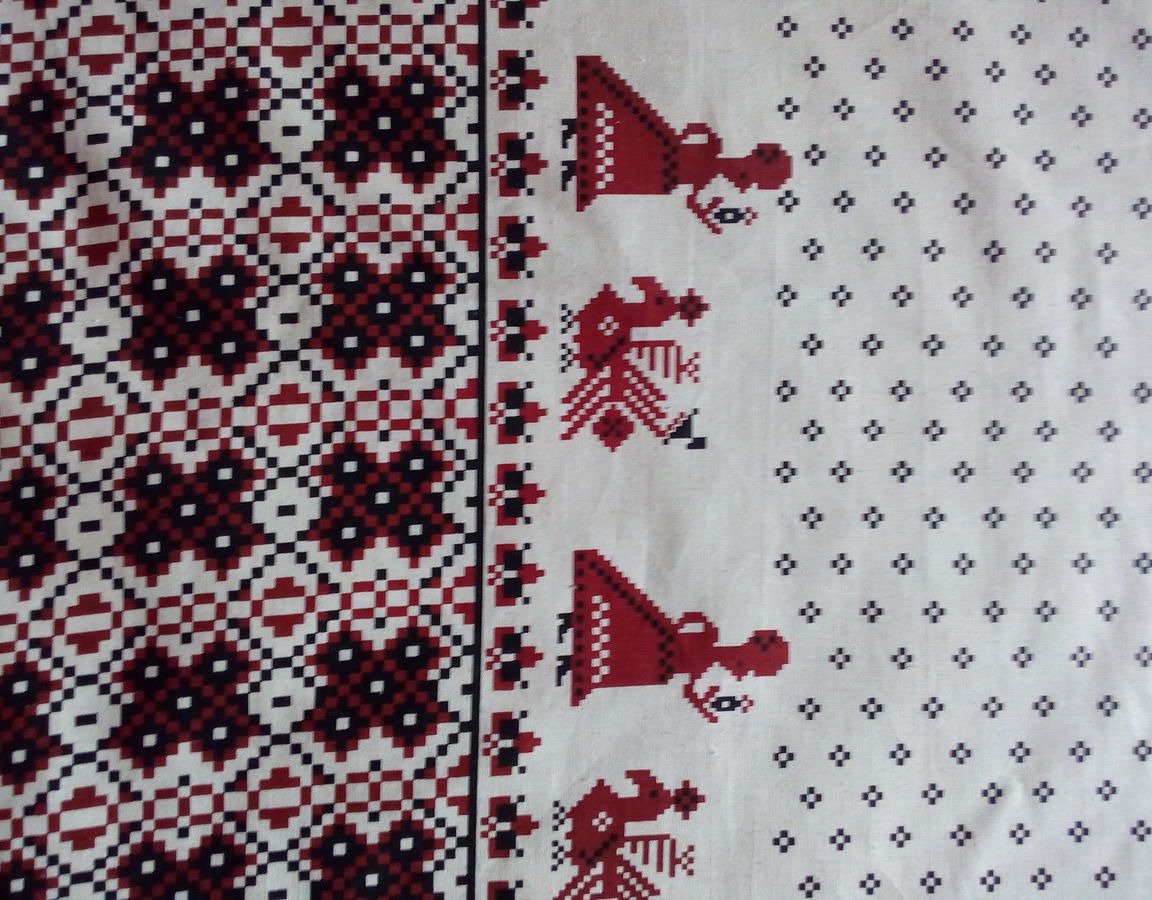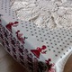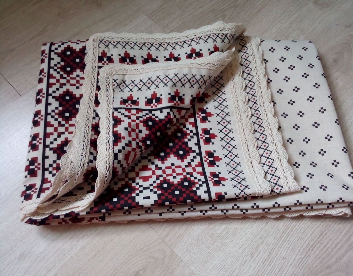 Орнамент идет по длине скатерти. По краям скатерть отделана хлопковым кружевом.