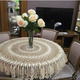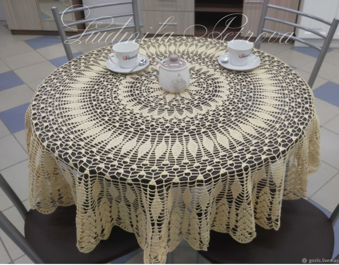 Скатерть 130-135 см в диаметре. Связана из итальянской пряжи. 100% мерсеризованный хлопок. Цвет шампань.Прекрасно подойдет для стола 80-90 см