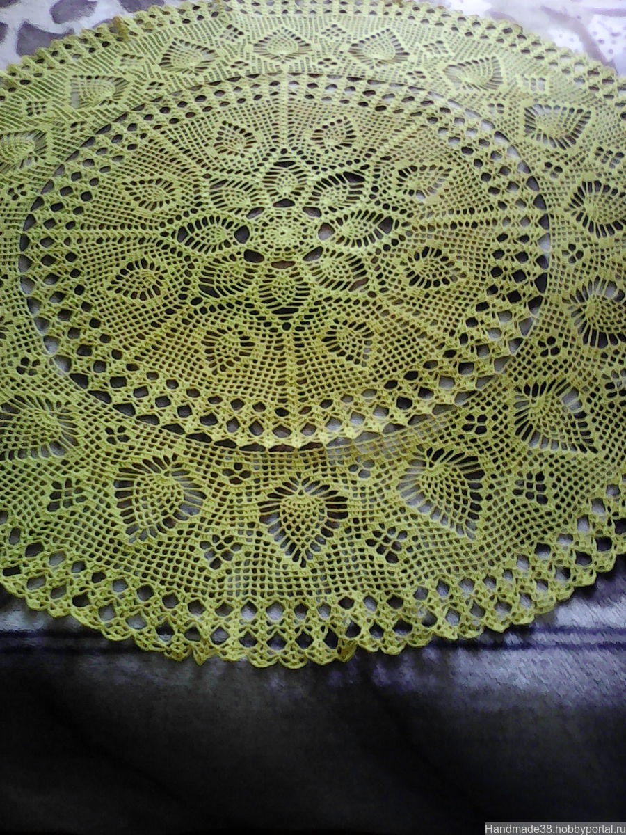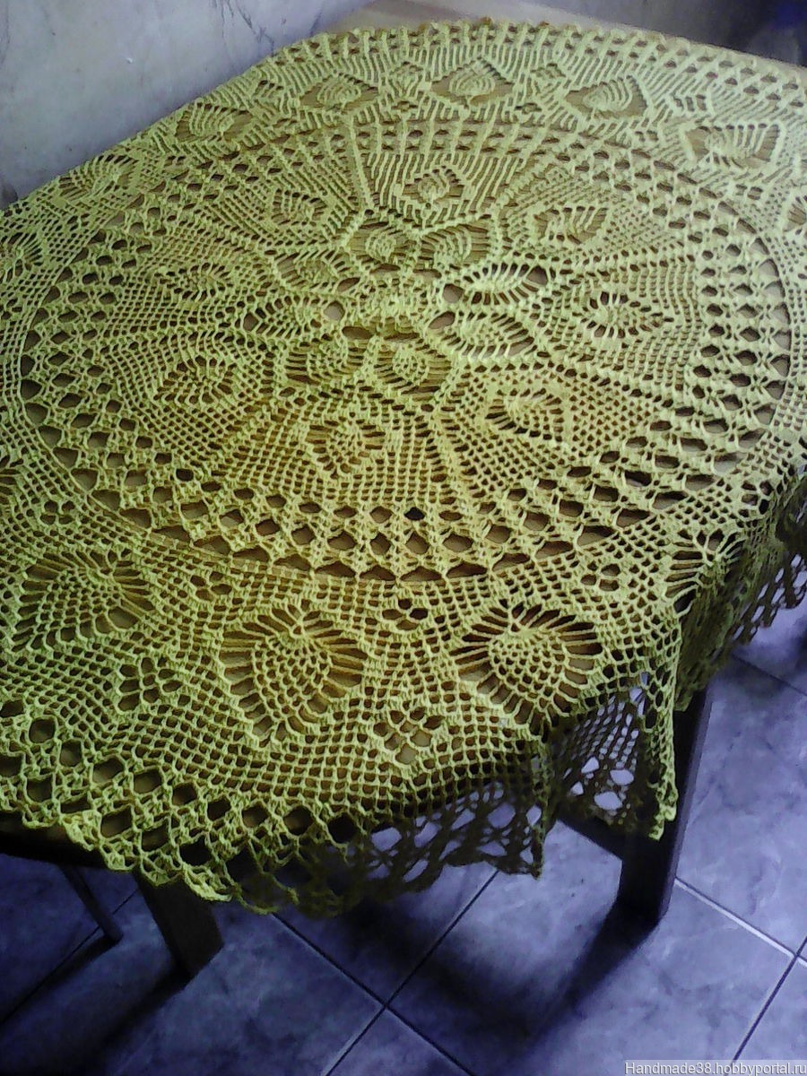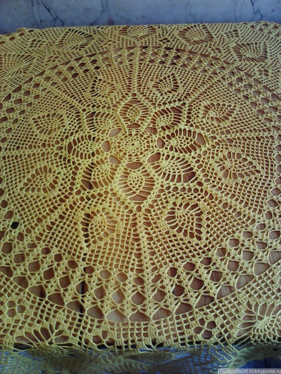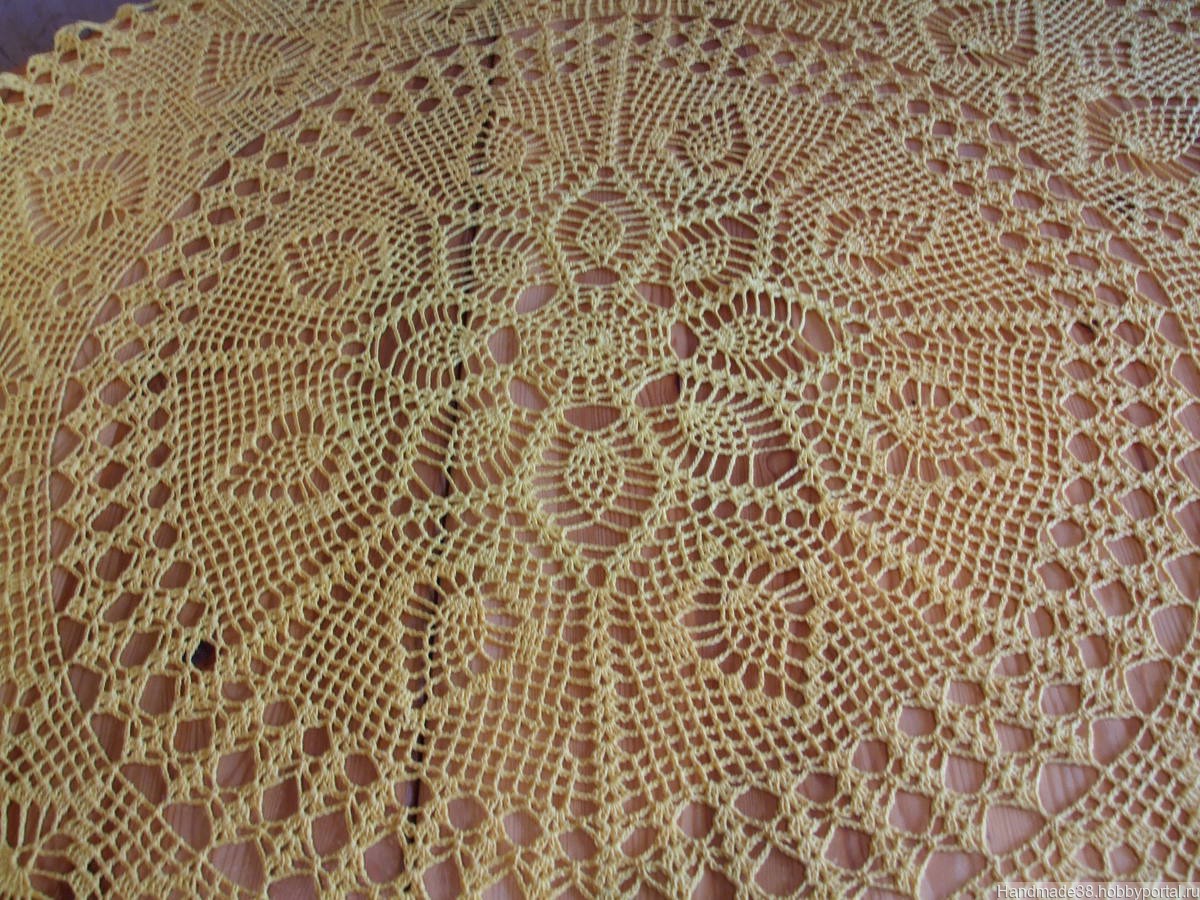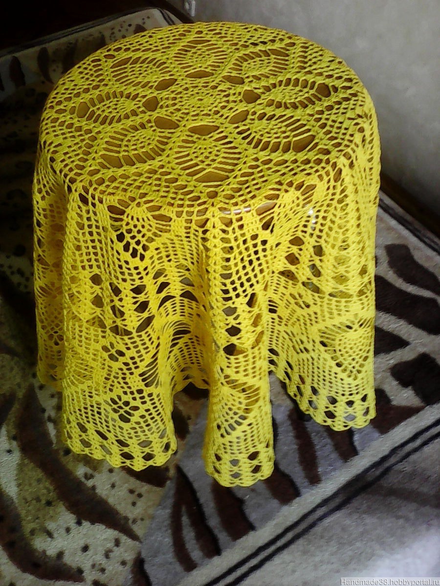 Скатерть связана из ниток "Флокс" ярко-желтого цвета. Диаметр скатерти 113 см. Великолепный подарок или для своего дома. Работа продана,сделаю на заказ,можно в другом цвете.Доставка:самовывоз из Люберец или отправка почтой после предоплаты(цена+почт.расходы).