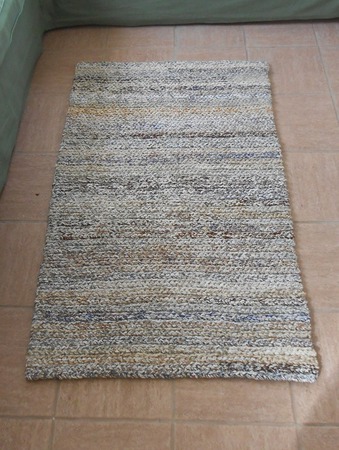 Тяжелый плотный шерстяной коврик. Средний размер - постелить перед кроватью креслом. Под ногами пружинит.