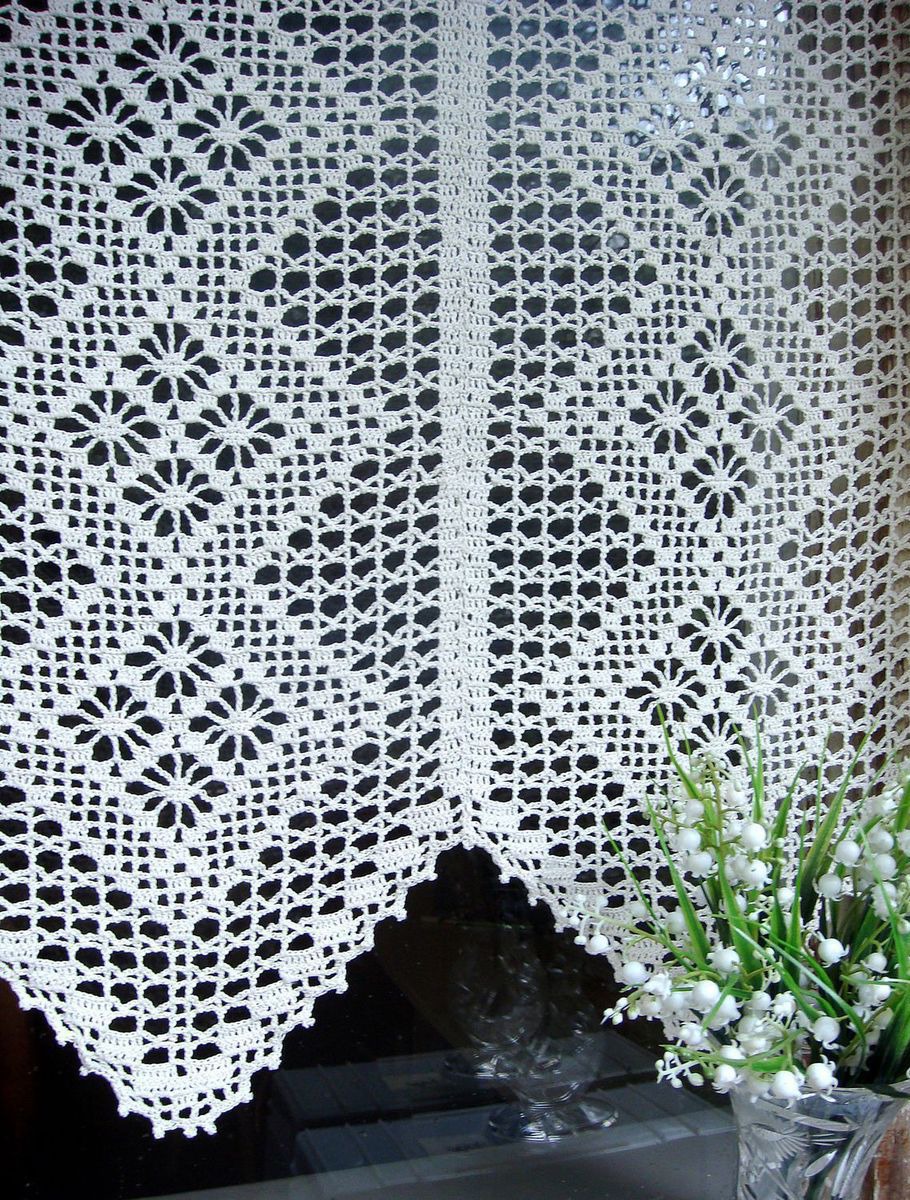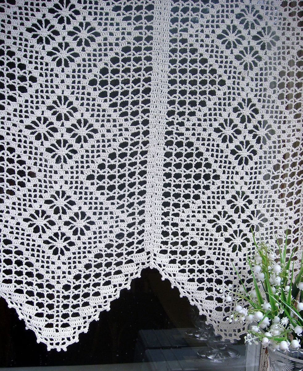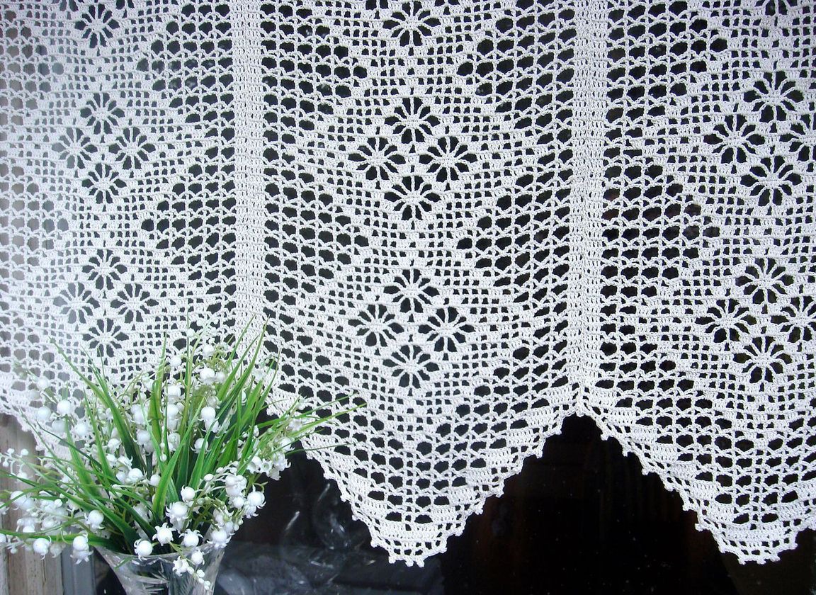 Изящная занавеска с рисунком "ромбы" связана крючком из хлопка белого цвета.