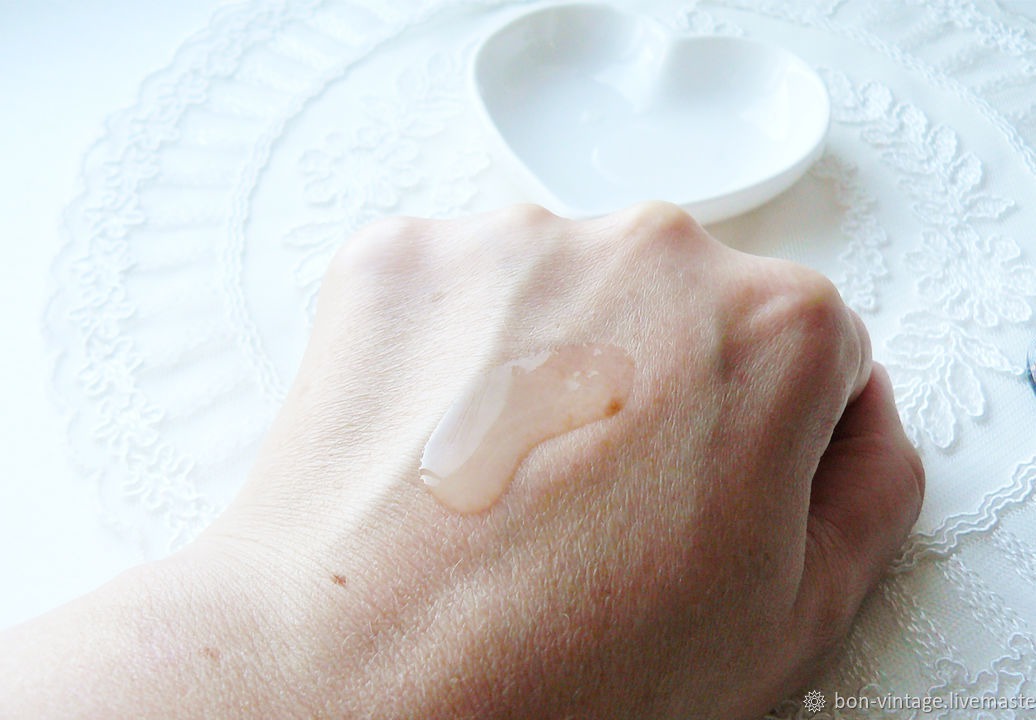 Чуть вязкая мутная жидкость с легким оттенком белого цвета. Легко наносится, быстро впитывается. Не создает ощущения липкости, жирности, пленки. Имеет тонкий растительный аромат.