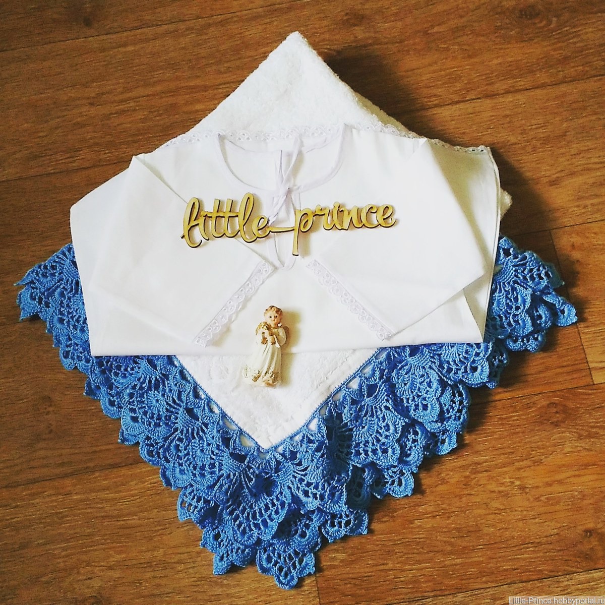 Набор для крещения мальчишки 2-3 лет. В набор входит большое белое полотенце с богатым кружевом по всему периметру и ситцевая рубашечка простого кроя.