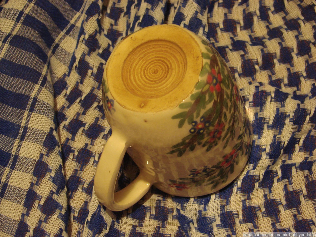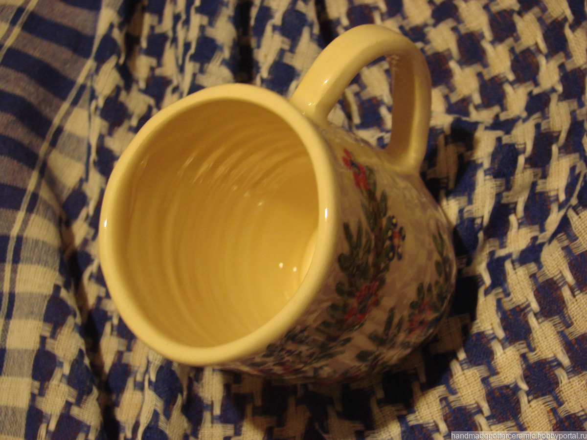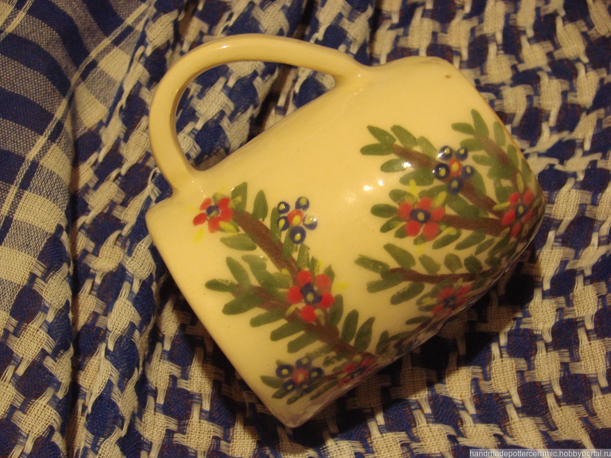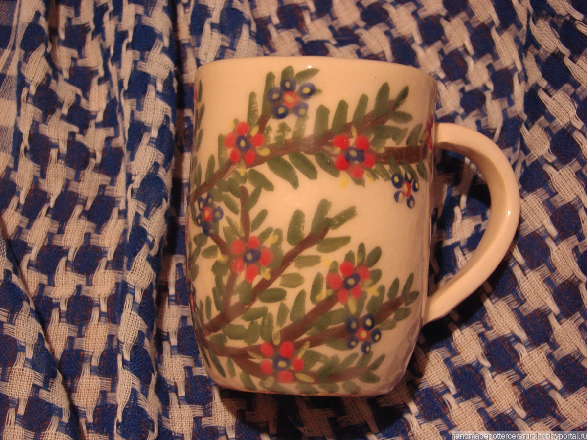 Чайная кружка сделана вручную из глины, внутри покрыта бесцветной глазурью, снаружи расписана ангобами и покрыта бесцветной глазурью, донце молоченое (покрыто молоком и обожжено при 350 градусах), из-за этого мыть ее в посудомойке крайне нежелательно.