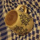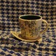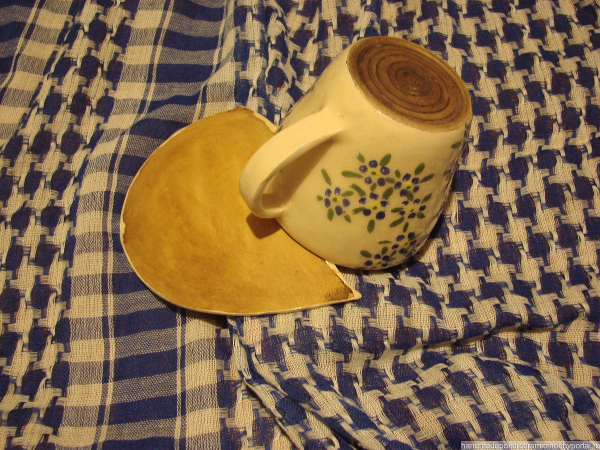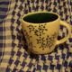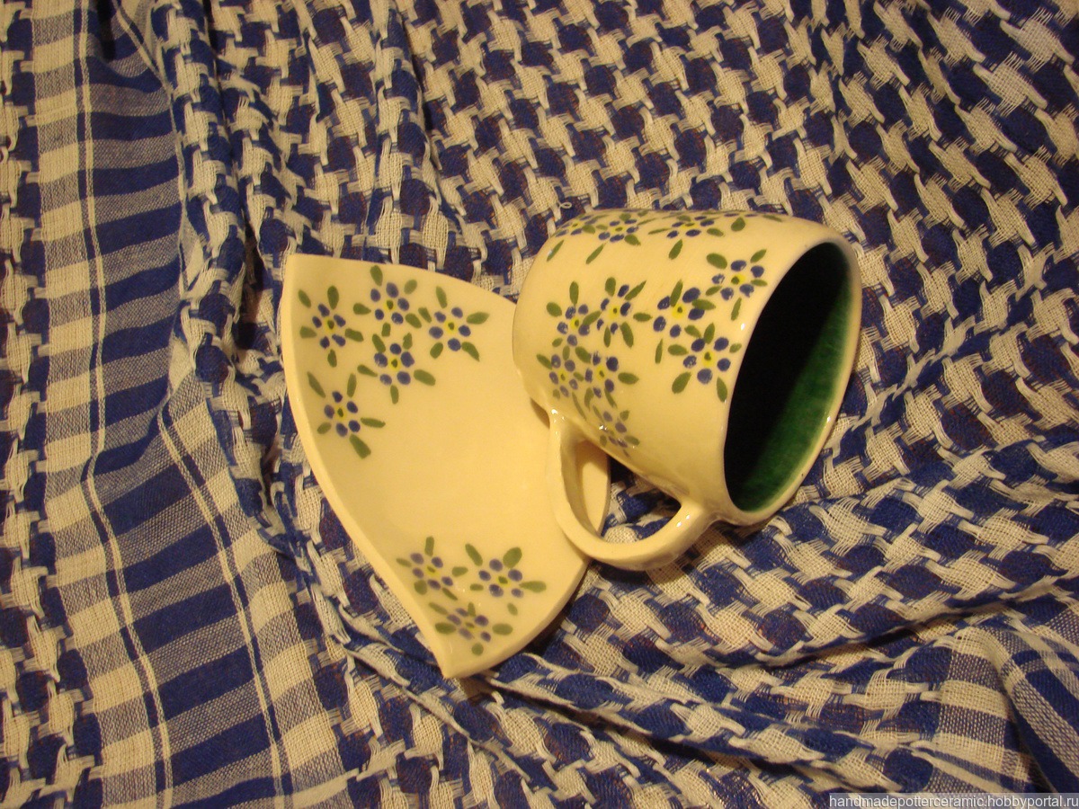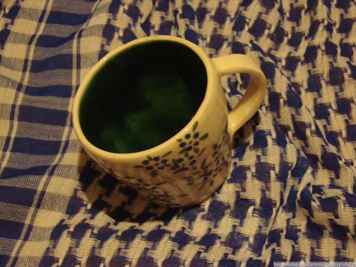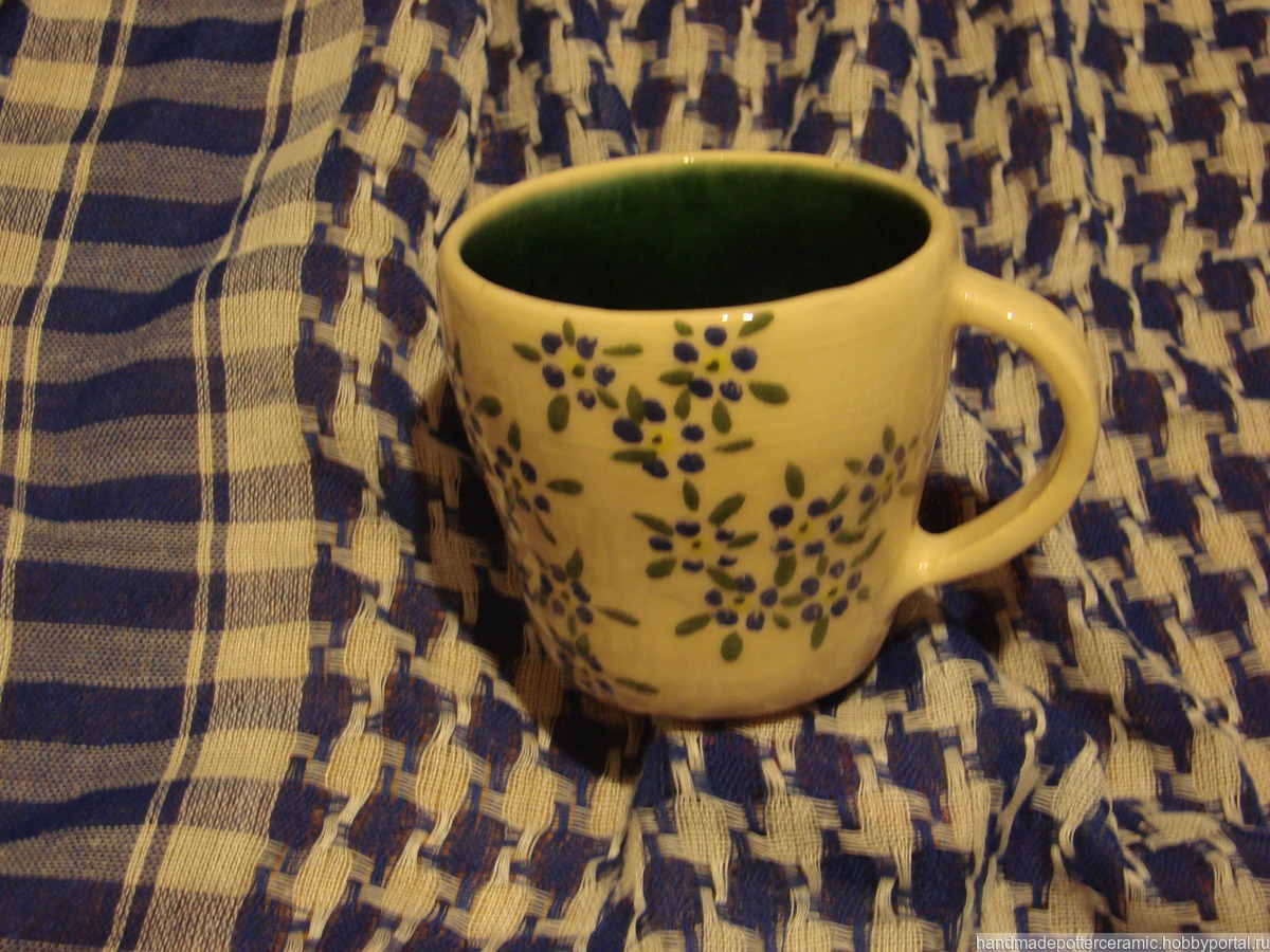 Чайная чашка сделана вручную из глины, внутри покрыта темно-зеленой глазурью, снаружи расписана ангобами и покрыта бесцветной глазурью, донце молоченое (покрыто молоком и обожжено при 350 градусах), из-за этого мыть ее в посудомойке крайне нежелательно.