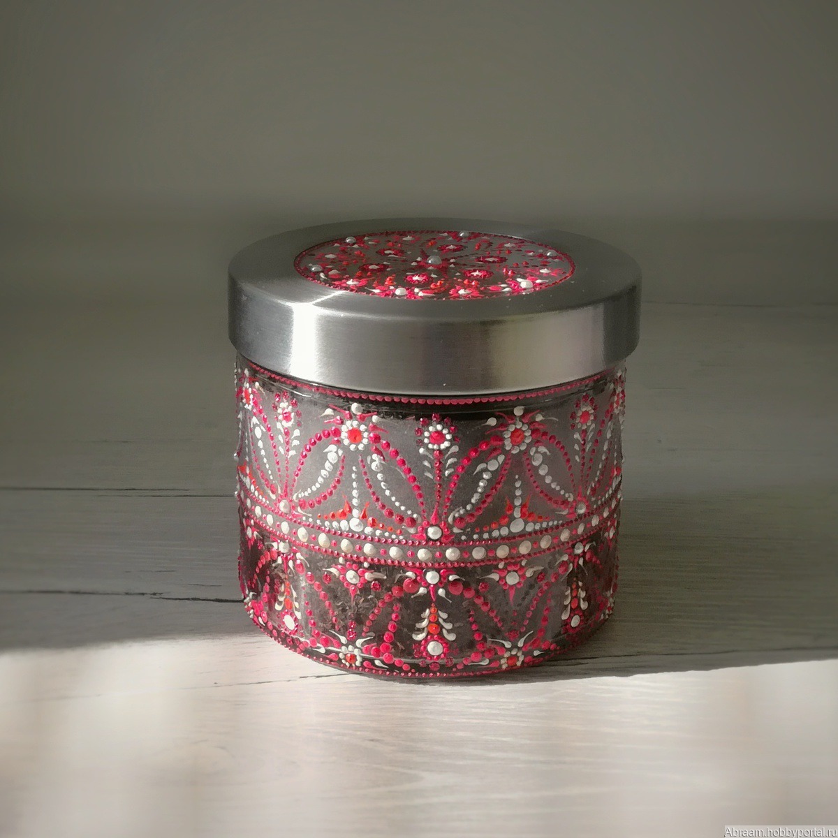 Баночка для сыпучих продуктов, украшенная вручную точечной росписью. Абсолютно функциональна. Роспись закреплена обжигом. Возможно исполнение в любой цветовой гамме.