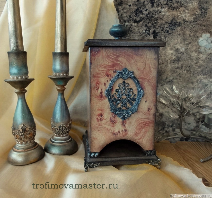 Чайный домик-имитация карельской березы, с объемными, декоративными элементами под цвет черненого серебра.Выполнен в технике декупаж, с прозрачным, перламутровым блеском, свойственным древесине карельской березы. Довольно тяжелый и добротный, из толстой фанеры и дерева, на ножках. Внутри домик затонирован кофем, для безопасного соприкосновения с пищевыми продуктами. В домик помещается до 100 пакетиков чая.