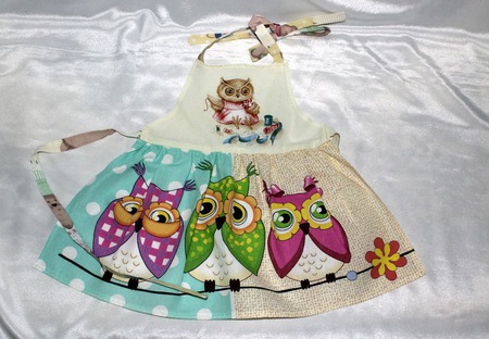 Детский фартук с принтом совы. Рассчитан на возраст от 4 до 7 лет. В этом возрасте девочки активно начинают помогать маме, и чтобы быть и красивыми и аккуратными, подарите фартучек.