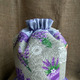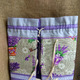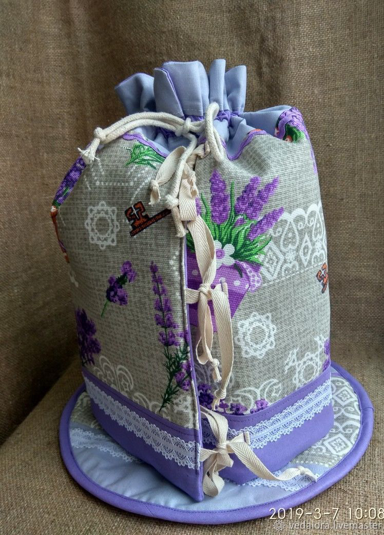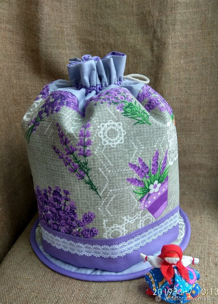 Грелка размером 38 на 80. С помощью завязок из киперной ленты ширина регулируется в пределах 10 см. Уплотнена дублирином и синтепоном. Украшена тесьмой вьюнок и кружевом. Сверху затягивается х/б шнуром.