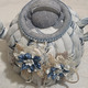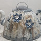 Украшена цветами из джутовой ленты, кружевом, декоративным шнуром и бусинами.