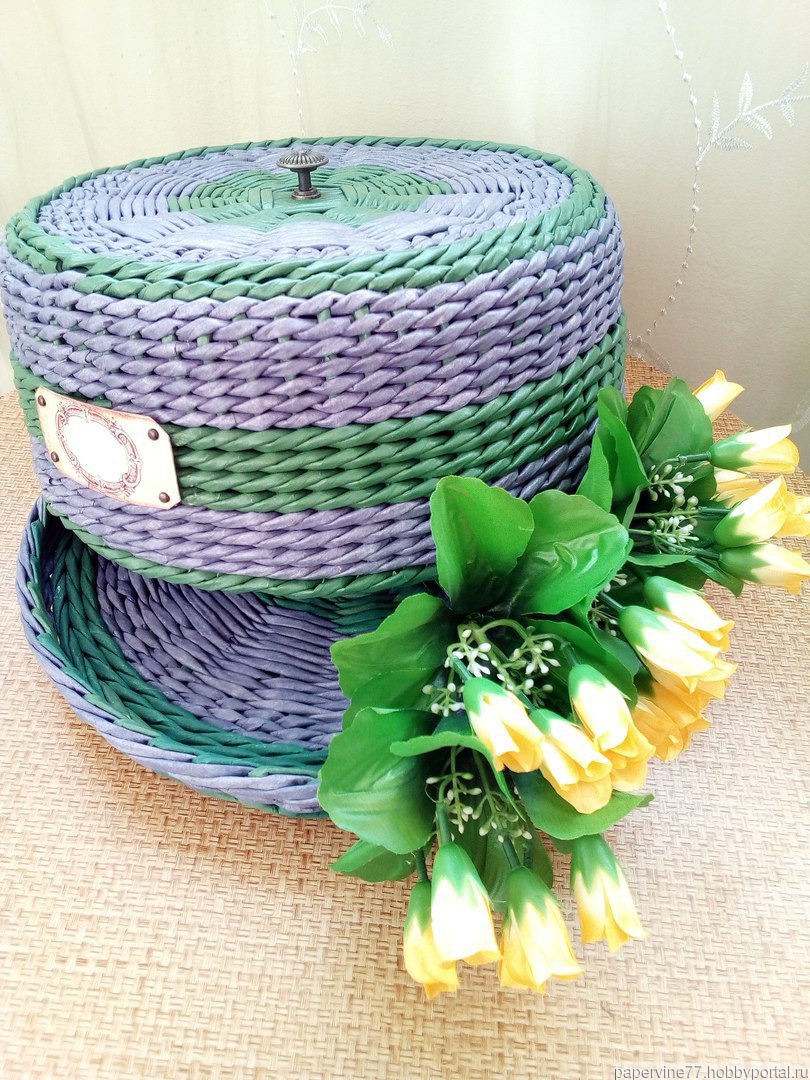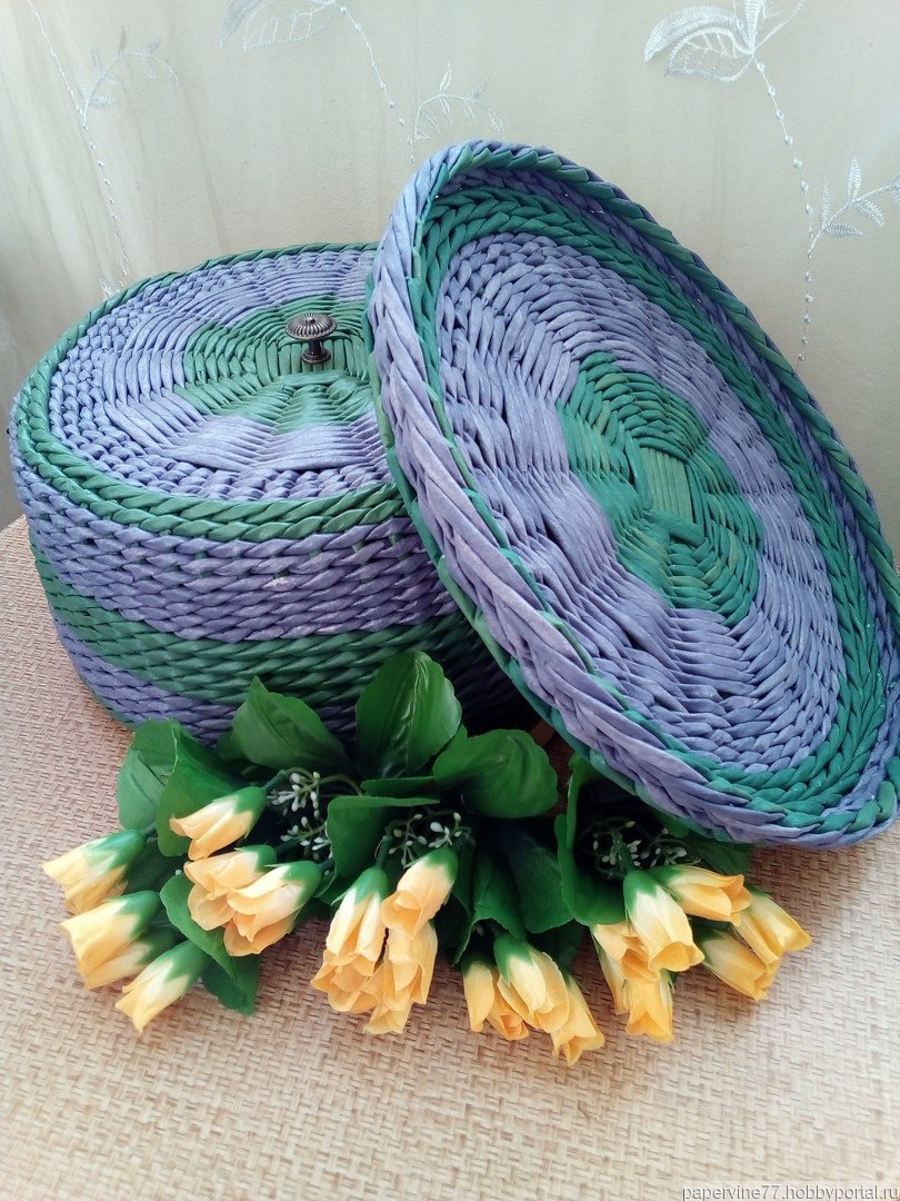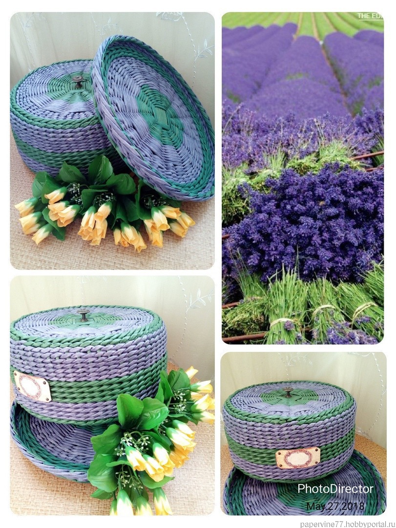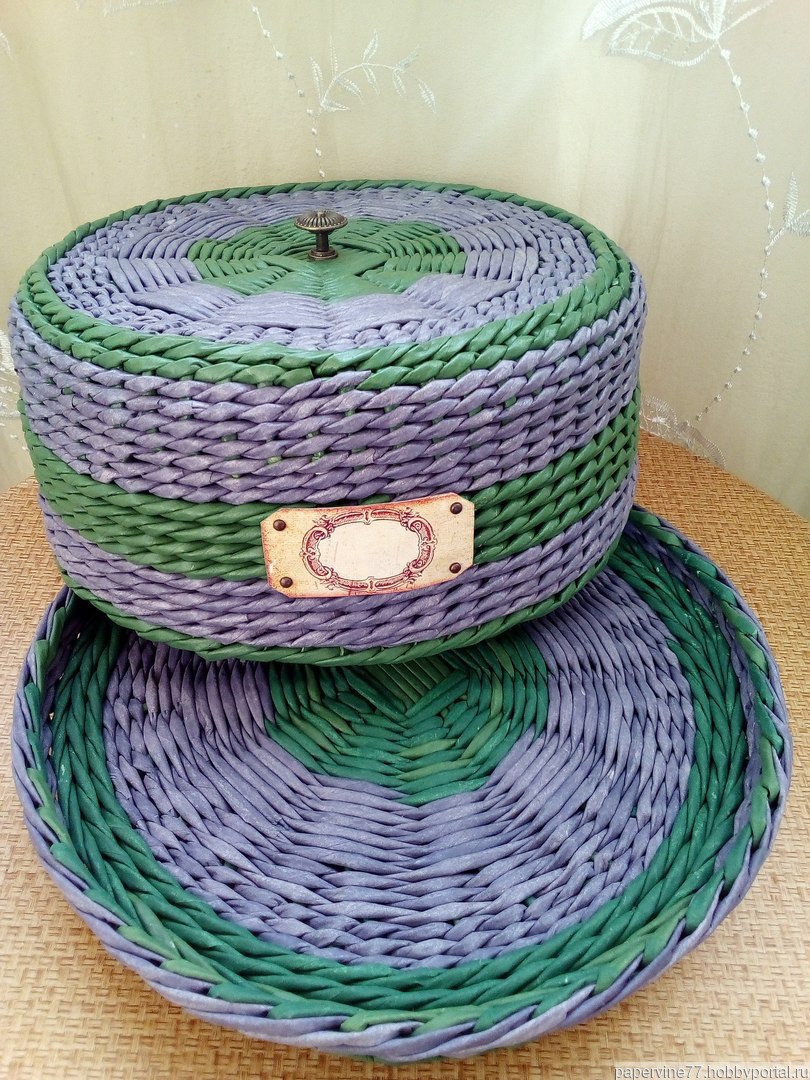 зелёный, фиолетовый, кухня, поднос, хлебница, хлебница ручной работы, крышка, круглая, лавандовое поле, бумажная лоза, хлебница плетеная