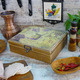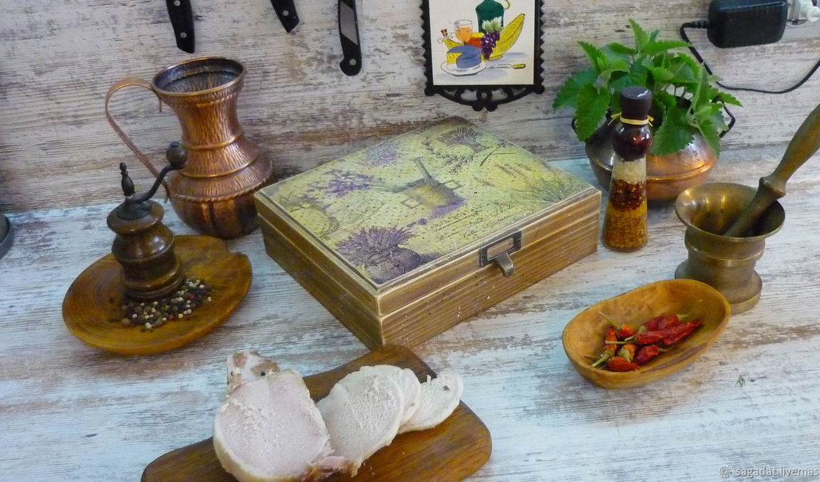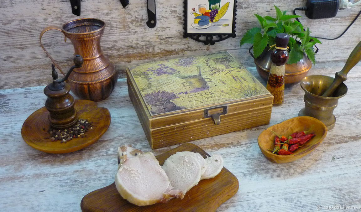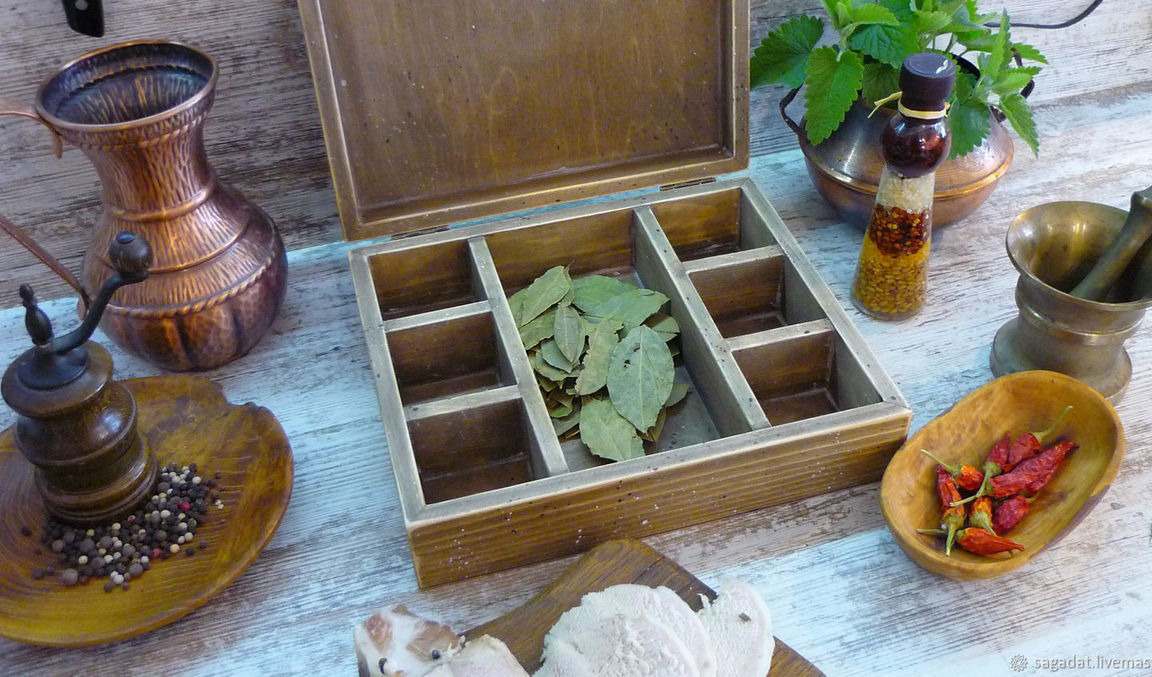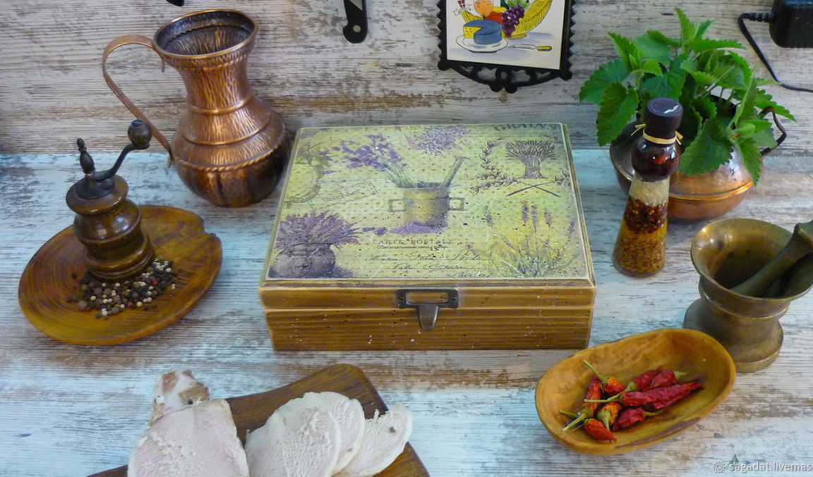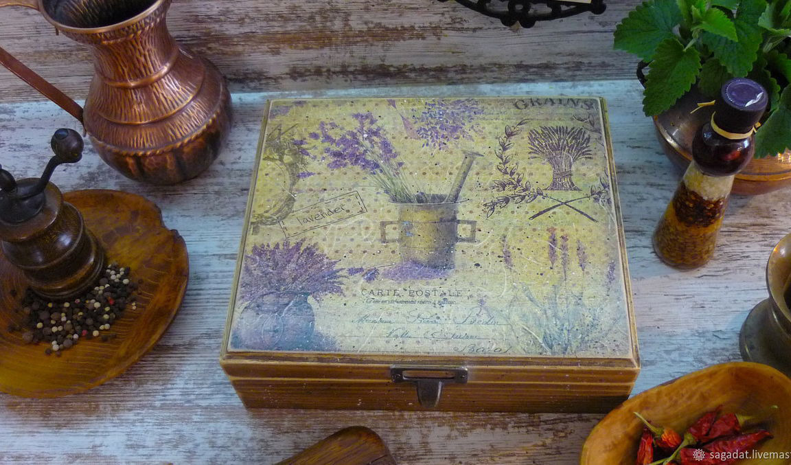 Удобное и компактное хранение специй. В шкатулке много отделений, размеры идеально подходят для того колличество специй, которое мы обычно покупаем в магазинах. Шкатулка из массива сибирской сосны, очень красивый рисунок древесины. Декорирована в стиле Френч винтаж, искусственно состарена. Внутри шкатулка затонирована раствором натурального кофе, обработана льняным маслом, все ЭКО. Снаружи обработана лаком и профессиональными маслами с твёрдыми восками для дерева, отполирована пчелиным воском, идеально гладкая приятная тактильно. Фурнитура металлическая, также состарена. Уход: пыль, загрязнения вытирайте влажной тканью. А я желаю Вашему дому уюта и добра!