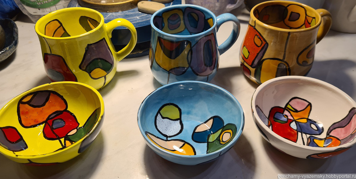 Кружки выполнены вручную из глины,расписаны пищевыми глазурями также вручную. Пиалочки к кружкам +200 руб.
