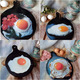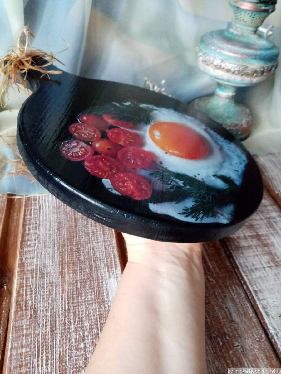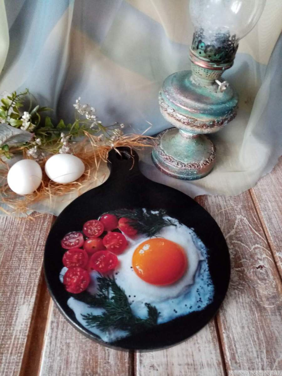 Кухонная доска-яичница , с 3Д эффектом выполнена на деревянной заготовки из сосны. Ее размер 29-22 см ( почти лист А4). На лицевой стороне изображена аппетитная яичница. Досточка многократно покрыта акриловым лаком ( поэтому ее можно спокойно мыть). Обратная сторона обработана средством на основе пчелиного воска.