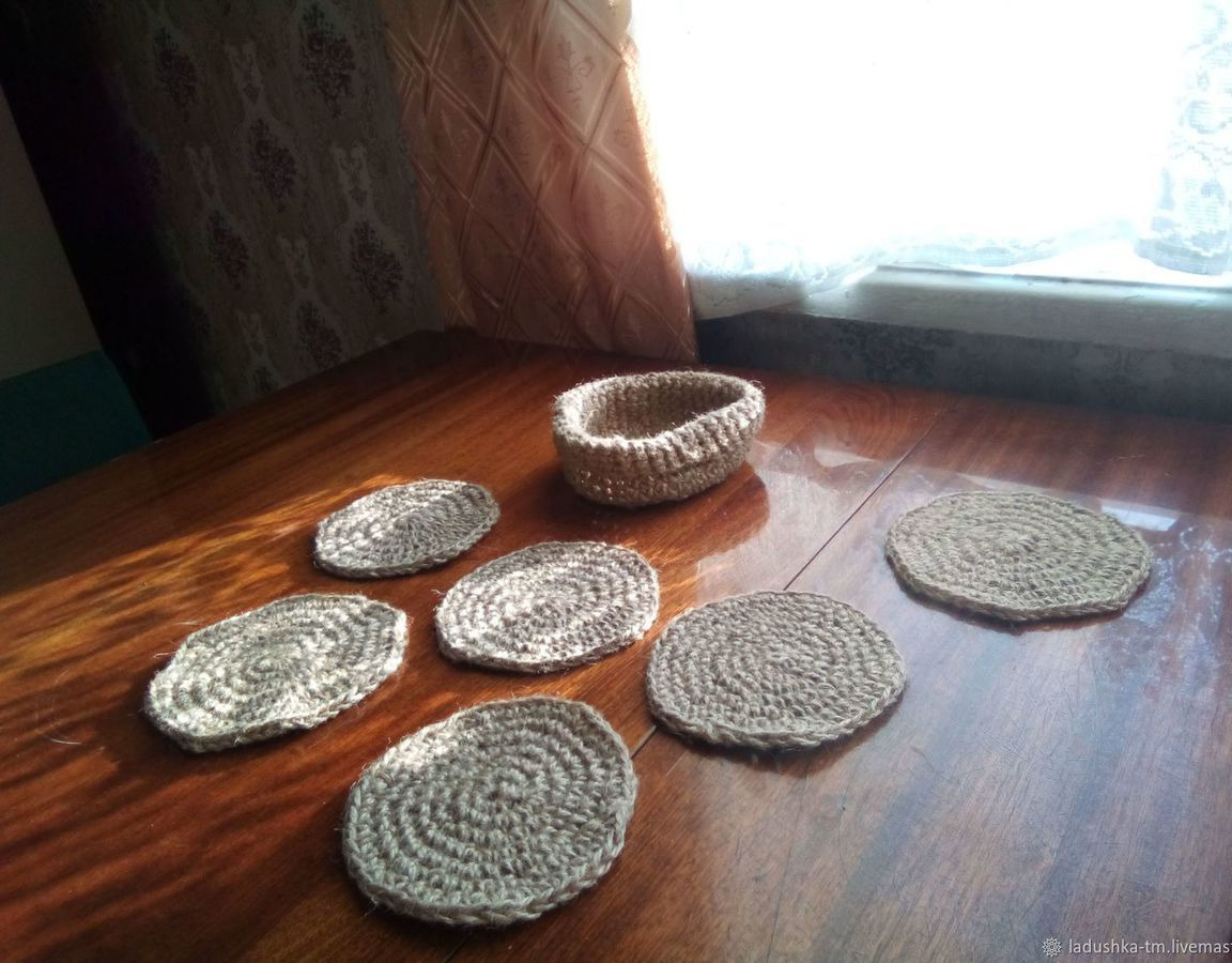 Даже в будние дни на кухне или в столовой должно быть красиво. Это залог отличного настроения и прекрасное начало дня. Различные вязаные мелочи для интерьера - прекрасная возможность создать комфорт и уют практически без усилий. Кроме этого, различные подставки и салфетки выполняют и чисто практическую функцию: они защищают полированную поверхность мебели от пятен и царапин, особенно если это что-то горячее. Выдерживает температуру сковороды, снятой с огня (проверено личным опытом). Круглая вязаная салфетка из джутовой пряжи. Диаметр салфеток 12 см., корзинка 12 на 9 см. Ручная работа.