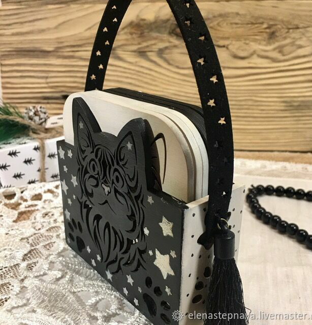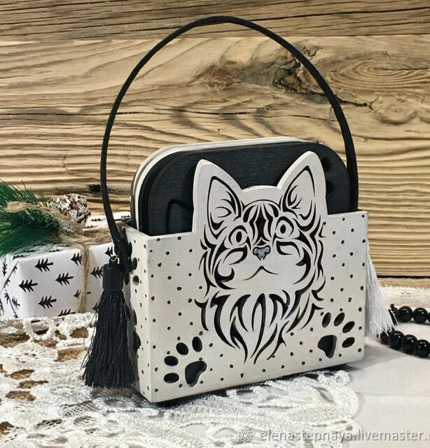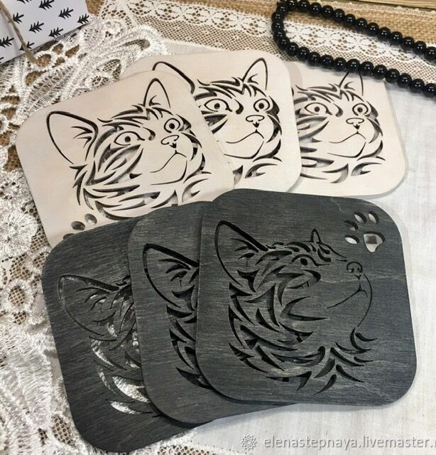 Набор подставок под чашки с вырезанными котиками из фанеры. В наборе 6 подставок в футляре. Окрашены морилкой и покрыты лаком.