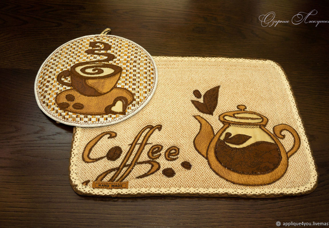Отличный подарок! Прихватки пригодятся вам на кухне, возможно использовать в качестве подставки под бокал. Аппликация. В набор входит от 2 до 6 прихваток и подставка под горячее блюдо или противень. Подставка может быть выполнена с аппликацией чайника или же с такой же чашечкой, как на прихватках. Возможен повтор, но уже из другой расцветки.