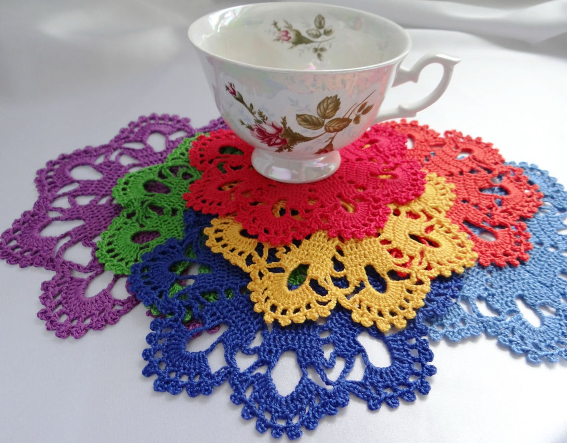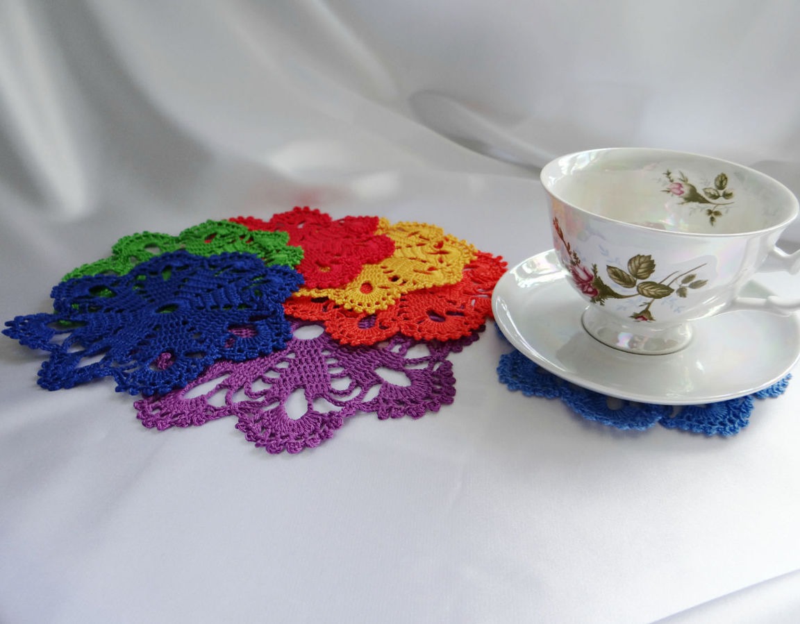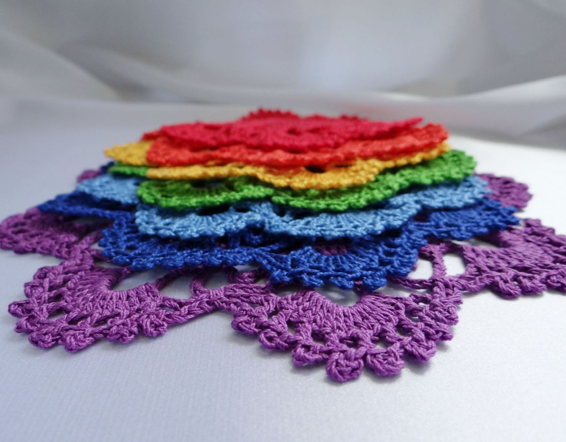 подарок на любой случай, украшение для кухни, комбинированный, подарок ребенку, подставки под кружки, подставки под чашки, подарок на день ангела, семья, набор салфеток крючком, подставки под горячее, Подарок на именины, подставки вязаные, хорошее настроение, подарок домохозяйке, радужное настроение, для детского праздника, радужный подарок, на детский праздник, радужный цвет радуги, радуга лето солнце дождь, подставки для детей, для семейного чаепития