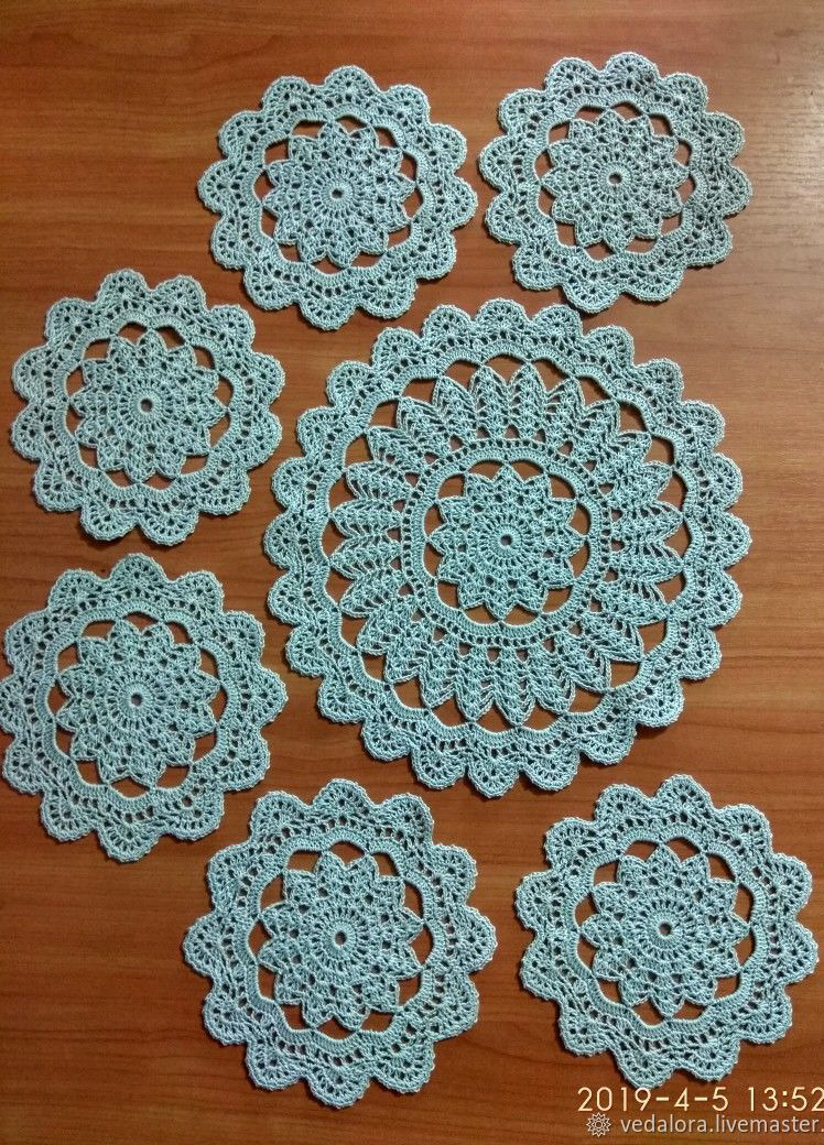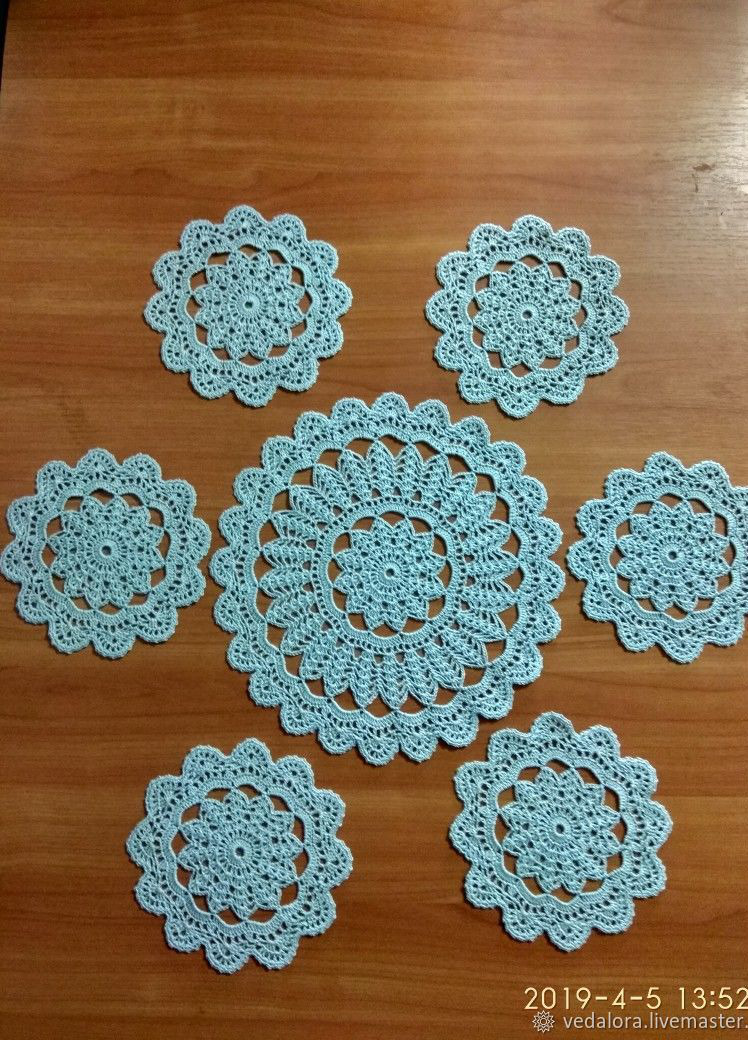 Ажурный набор подставок под горячее состоит из 7 салфеток - 1 большой и 6 поменьше. Связаны из 100% хлопка.