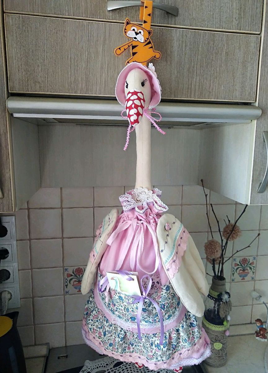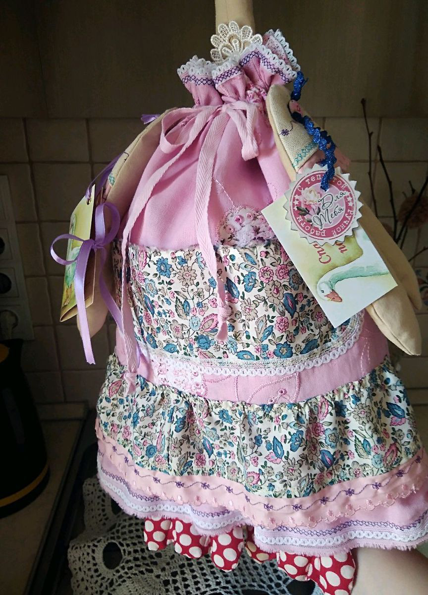Гусь-пакетница - прекрасный подарок нашим любимым мамам, бабушкам, тётям, подругам! Вызывает приятные эмоции. Создает уют, дарит прекрасное настроение. Декорированный мешочек для всяких нужностей, преимущественно на кухне, но вообще украсит и любую другую комнату, особенно, если это загородный дом, дача. Можно класть пакеты, сухие травы, чай или что-то другое на Ваше усмотрение.