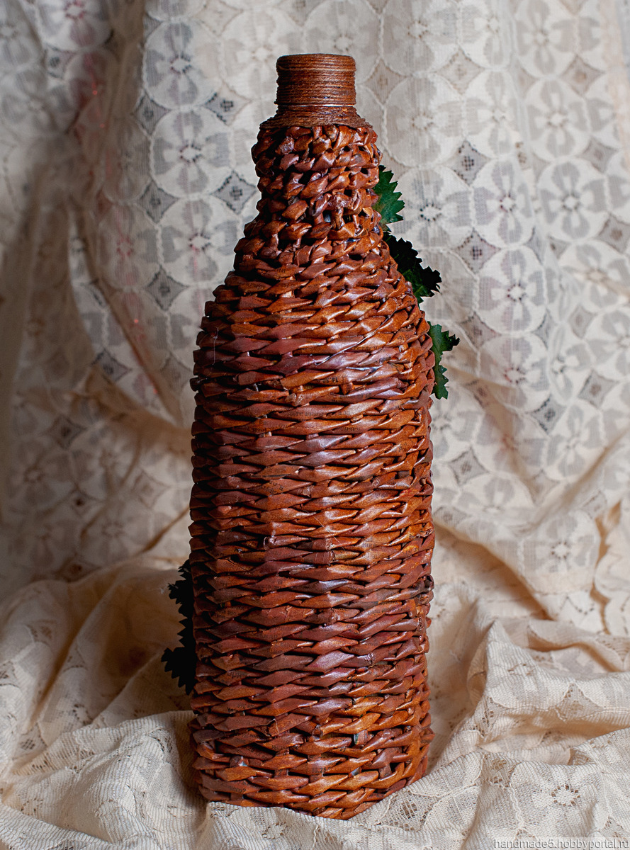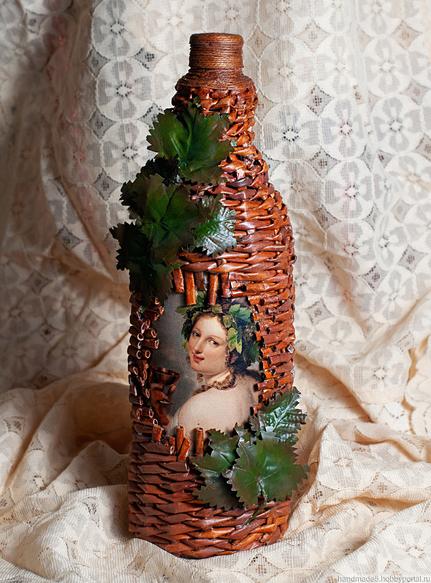 авторская работа, ручная работа, декупаж, предметы интерьера, подарочная бутылка, декоративная бутылка, плетёная бутылочка