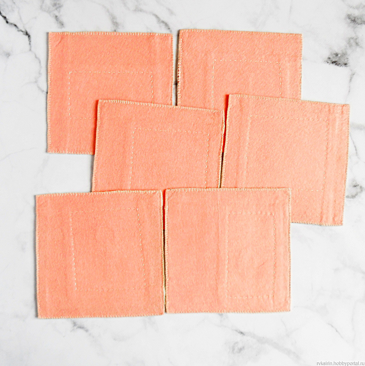 Полоски ткани по краям подставок из хорошего корейского и американского хлопка. Остатки от других больших проектов. Верхняя часть каждой подставки проклеена флизелином. Обратная сторона подставок из тонкого фетра средней плотности. Верхняя и нижняя части подставок сшиты тонкой светло-оранжевой х/б пряжей.