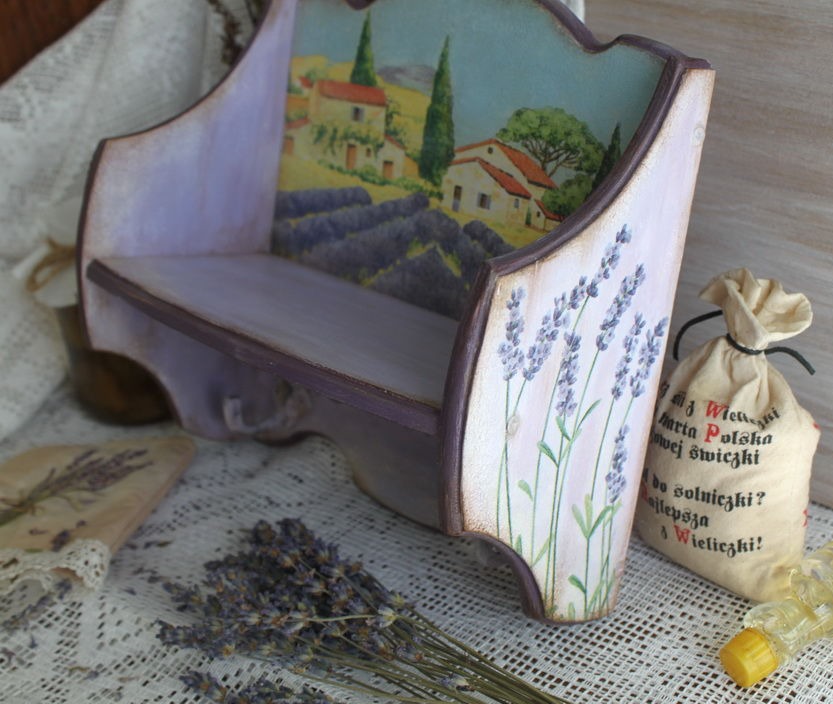 Чудесная деревянная полочка выполнена в технике декупаж прекрасно подойдет для кухни в стиле Прованс. На нее можно поставить баночки со специями, пряностями, с джемом или другие нужные вещицы. Полочка одновременно является и вешалкой на которую можно повесить прихватки, полотенца или мешочки с сухой лавандой и другими ароматными травами. Такая полочка будет хорошо смотреться на даче или в загородном доме.