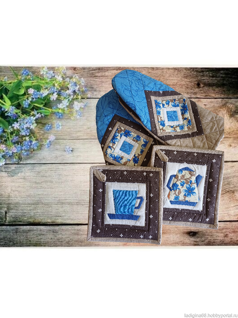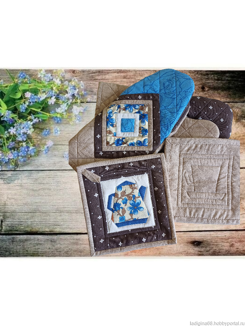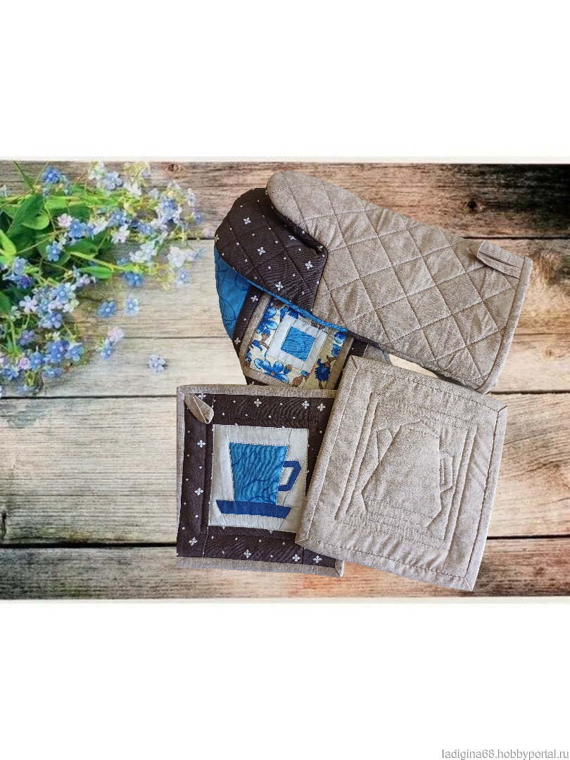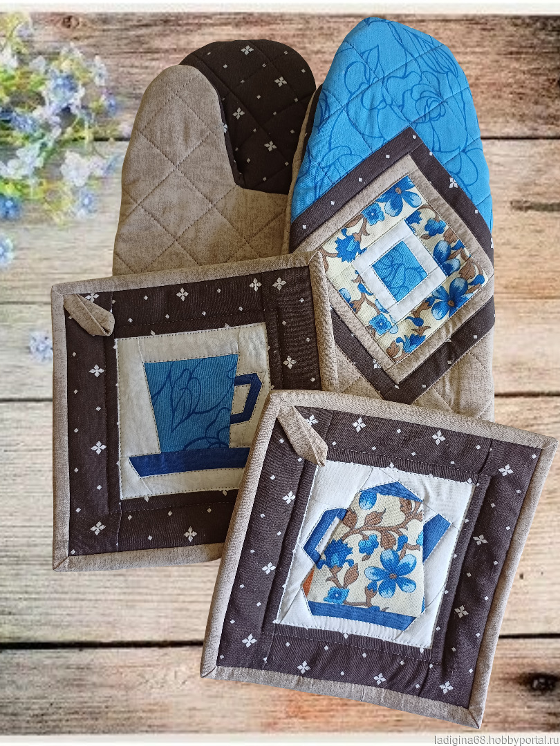 Комплект состоит из 2-х рукавиц на обе руки (правая и левая), это очень удобно, и 2-х прихваток. Всё выполнено в стиле лоскутного шитья — пэчворк.