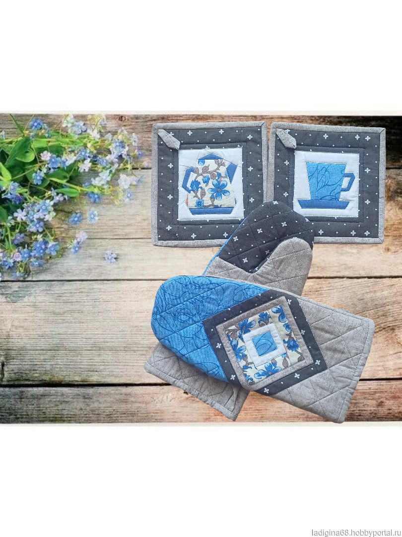Размер: Рукавички — длина 32см., прихватки — 19х19см.