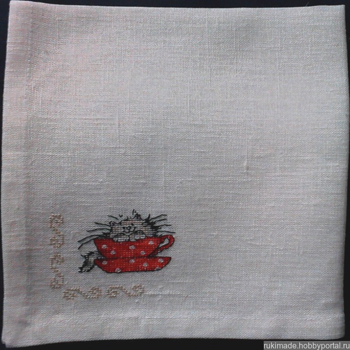 Льняная столовая салфетка из серии "Лукавые кошки". Тонкая вышивка на салфетке выполнена нитками мулине DMC в одну нить в технике счетный крест.