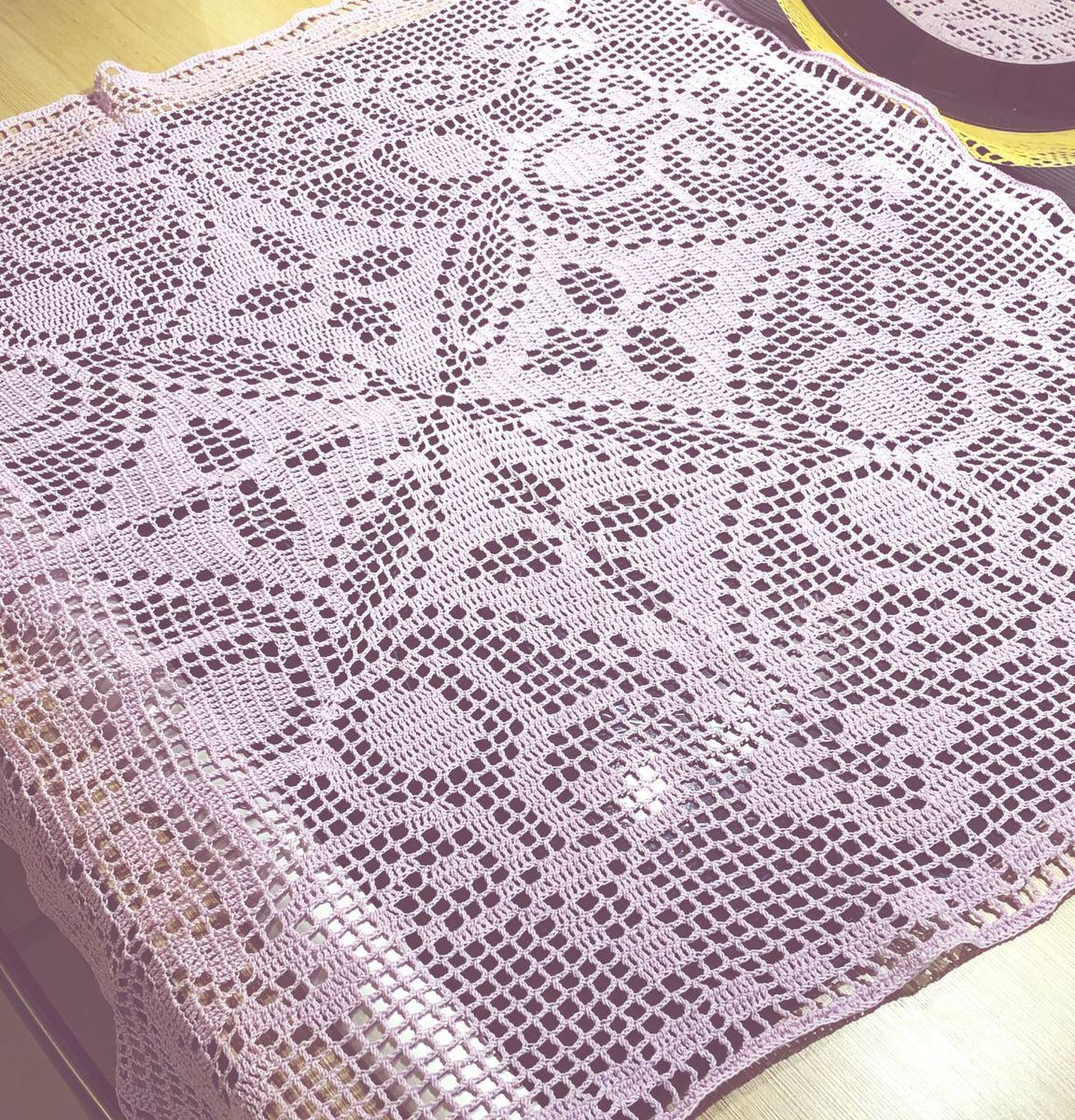 Салфетка связана в филейной технике из хлопковых ниток нежно сиреневого цвета, квадратной формы, размер 67х67 см