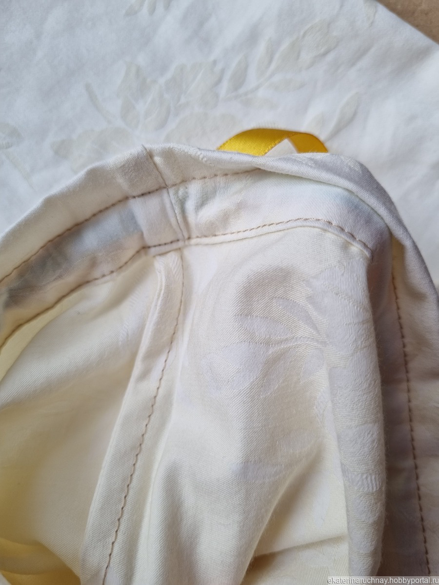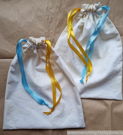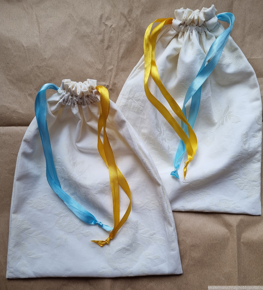 Выполнены из плотной хлопковой ткани ванильного цвета, с рисунком розочки. Экомешочки на кулиске, с завязками из атласных лент. Все швы закрыты и обработаны. Размер мешочка 25?27см.