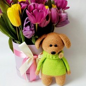 Собачка Кругляш - погремушка на деревянном кольце, вязанная крючком