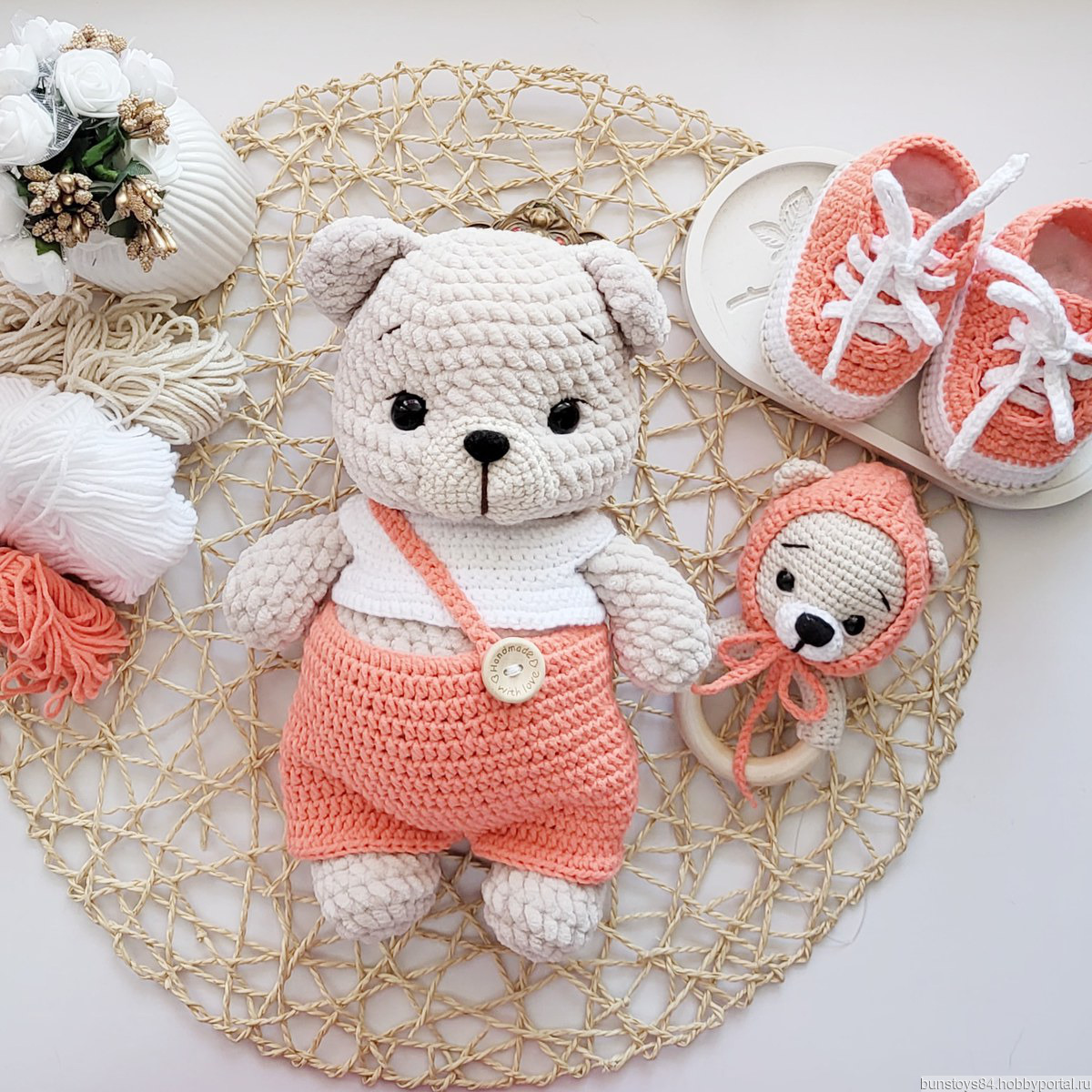 Милый набор для малыша. Мишка из плюшевой пряжи, погремушка и пинетки из полухлопка. Безопасная игрушка!