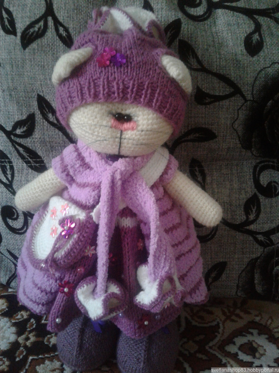 Вязаная кошечка тильда. Самостоятельно сидит и стоит. Одежда на кошечке вся снимается.