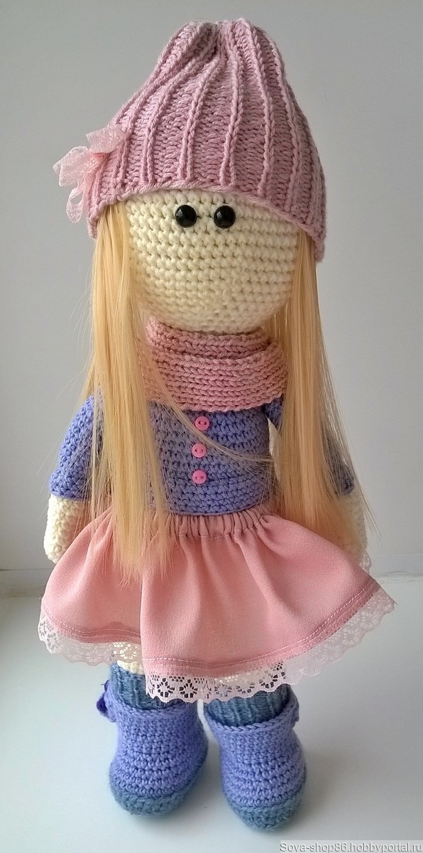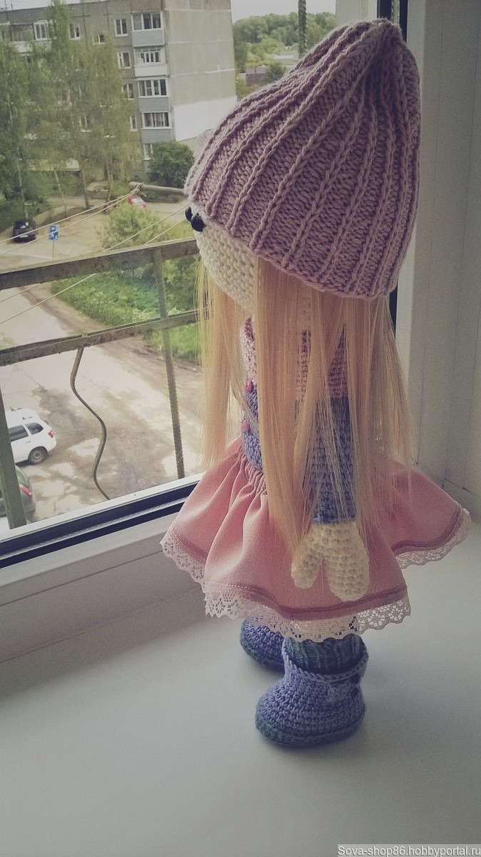 Куколка в высоту 35 см. Стоит самостоятельно. Шапочка и юбочка снимаются. Наполнитель лебяжий пух и холофайбер. Волосы искусственные. Глазки на безопасном креплении.