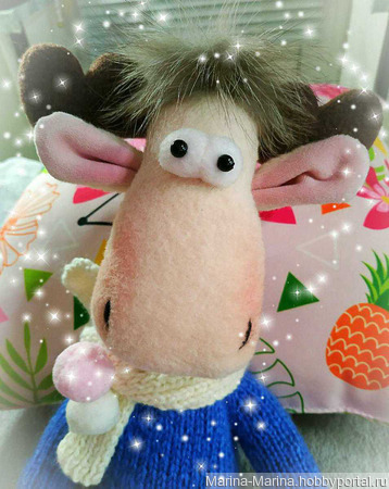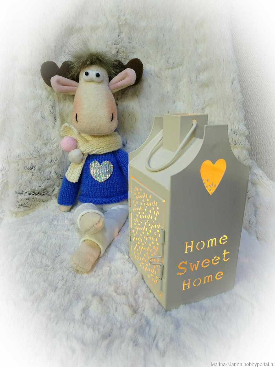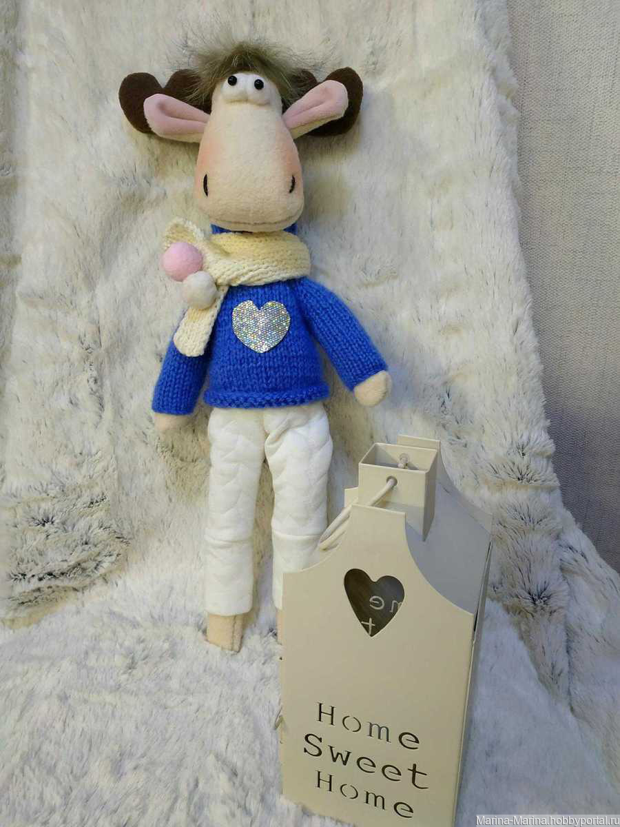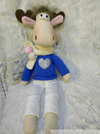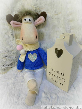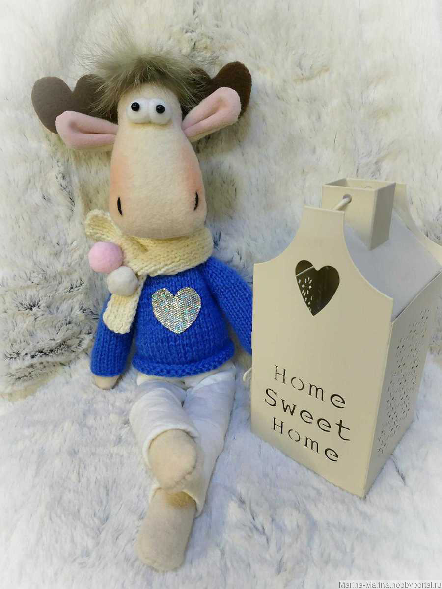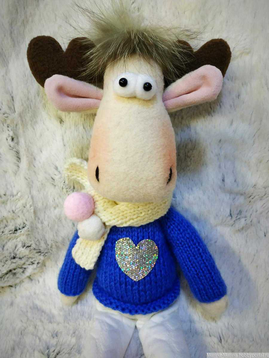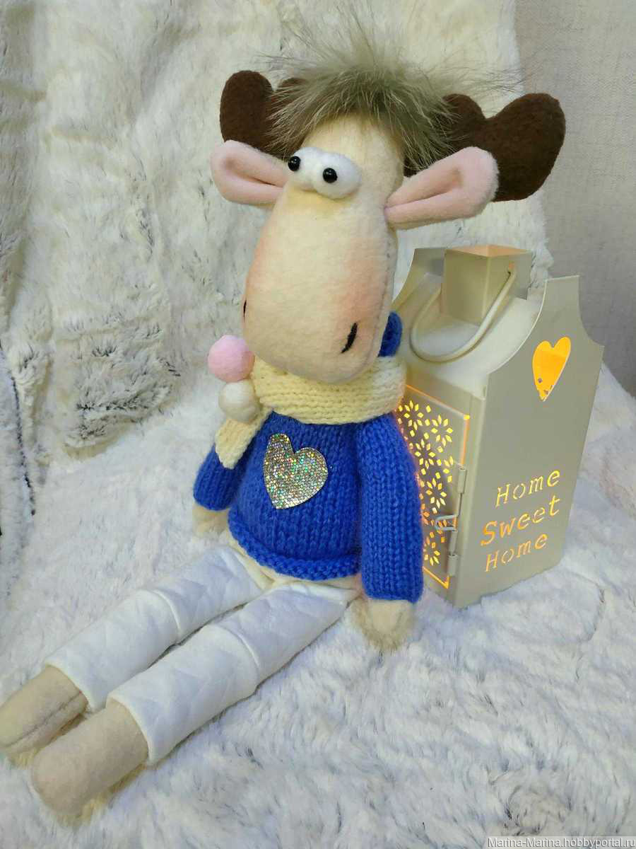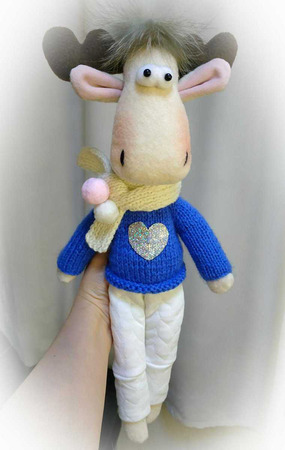 Милый забавный Лосик станет отличным подарком для ваших родных и близких и прекрасным украшением интерьера в предстоящие праздники, и порадует любого ценителя игрушек ручной работы.