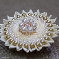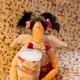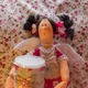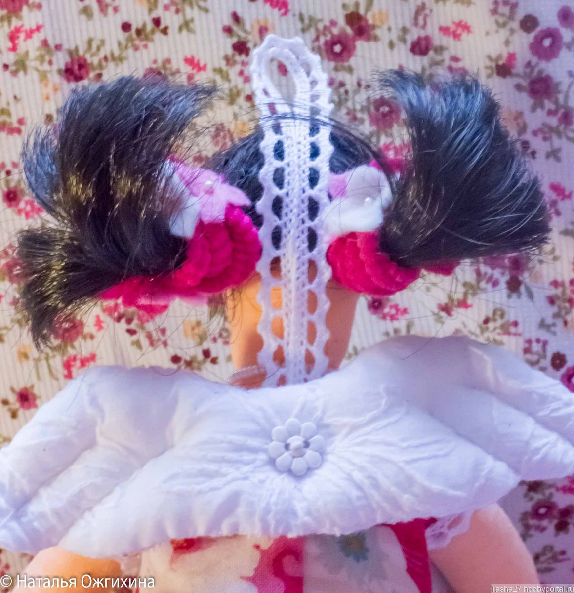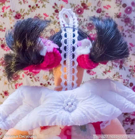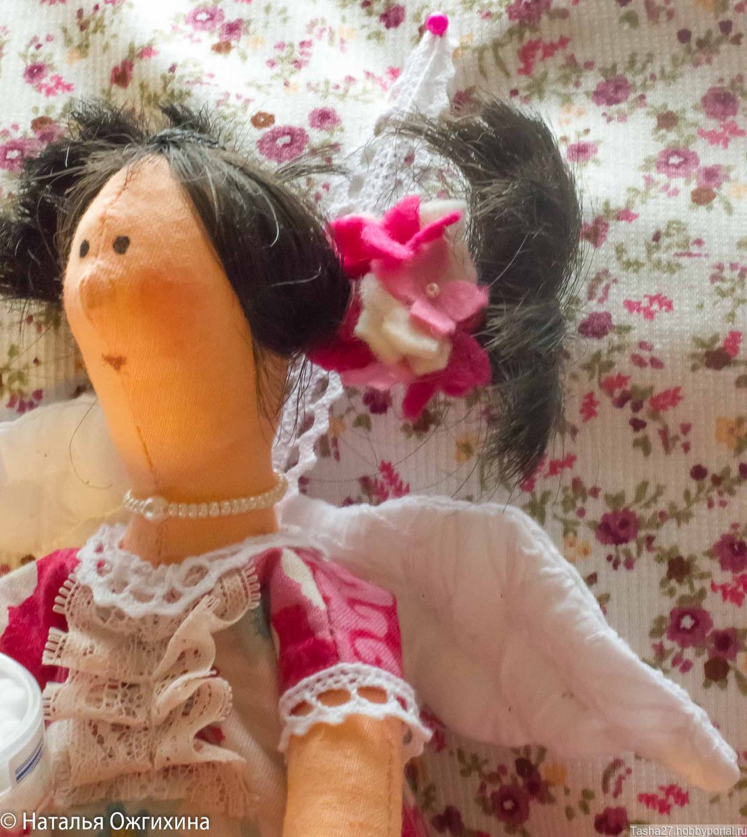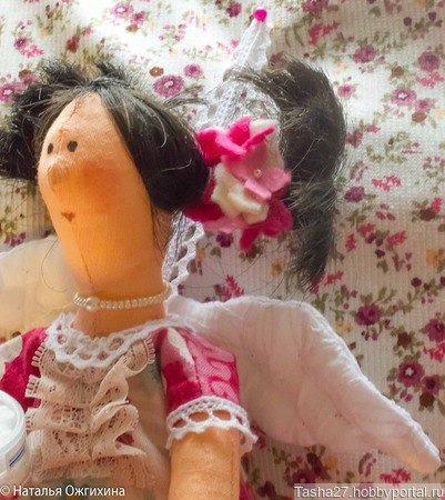 Интерьерная текстильная кукла. Волосы сделаны из атласных лент. В работе использован хлопок, фетр, бусины.