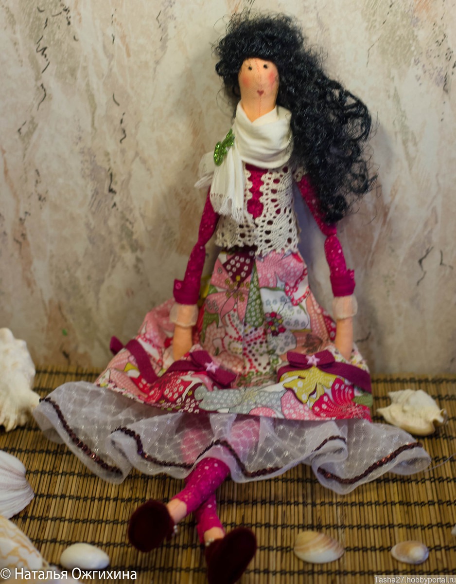 Интерьерная текстильная кукла. Волосы сделаны из атласных лент. В работе использован хлопок, фетр, бусины.
