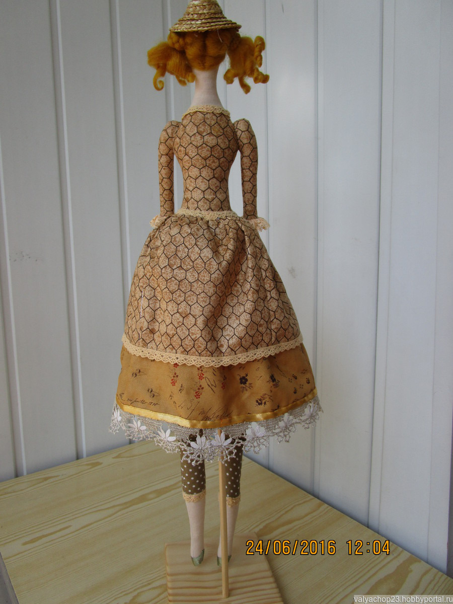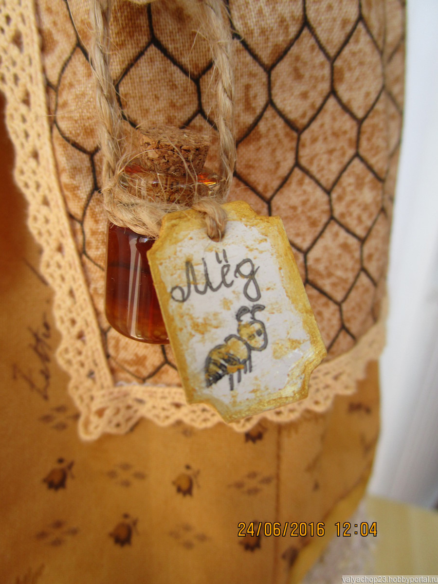 Кукла выполнена из бязи с наполнителем из холофайбера. Цветовая гамма одежды, головного убора и обуви соответствуют медовому окрасу. Это летняя девочка нежная, легкая, порхающая, как пчелки,окружающие её. Соломенная шляпка защищает её от палящего солнца. В руке она держит бутылочку с натуральным медом. Такая красавица может быть прекрасным украшением интерьера и замечательным подарком ребенку, женщине. близкому человеку. Самостоятельно не стоит, зато сидит с опорой, заложив ногу за ногу. Красивая игрушка, так и просится в Ваш дом.