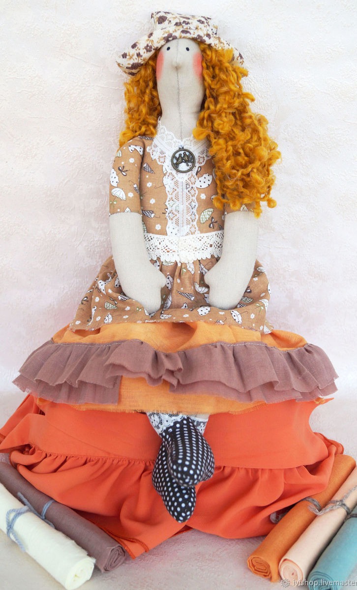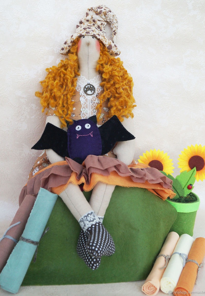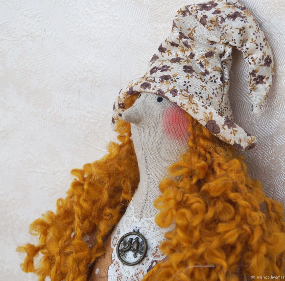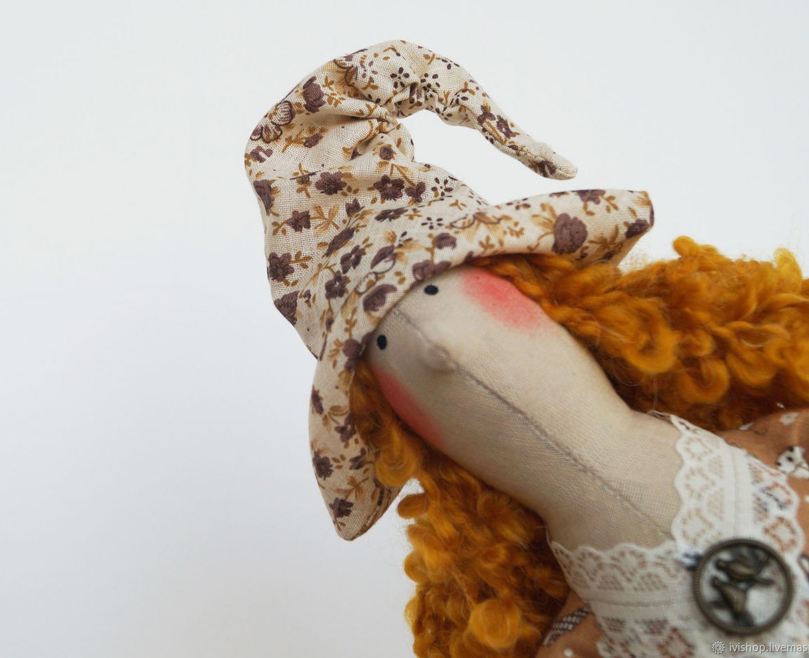 Ведьмочка сшита из хлопка 100%, плотно набита синтепухом. Глазки нарисованы не смываемой акриловой краской, щечки - художественной пастелью. Волосики из буклированной пряжи. Шапочка снимается. Одежда из хлопка, не снимается, украшена кружевом (капроновым и хлопковым), на шее - шармик в виде птичек.