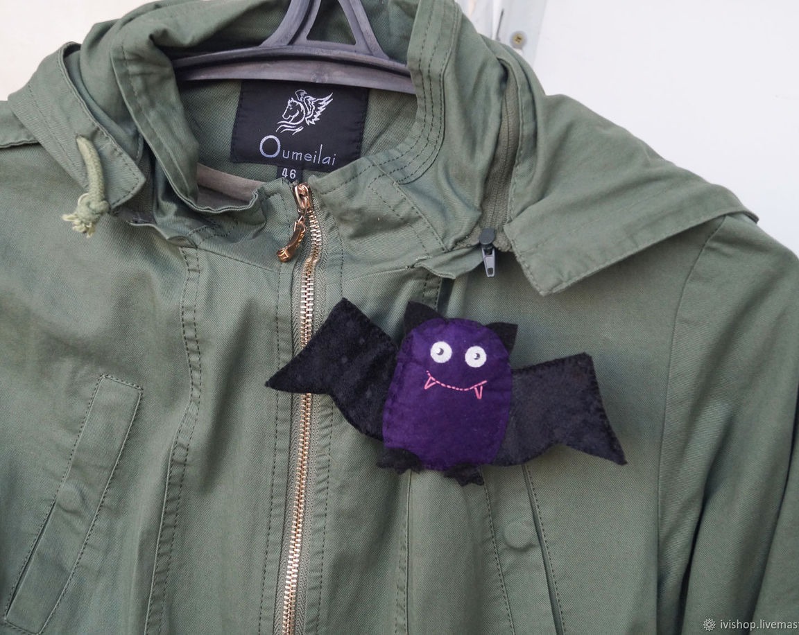 Летучая мышка сшита из фетра и велюра, слегка набита синтепухом. Глазки из фетра + акриловая (не смываемая) краска, ротик вышит нитками. Отличный вариант для украшения одежды к Хэллоуину!